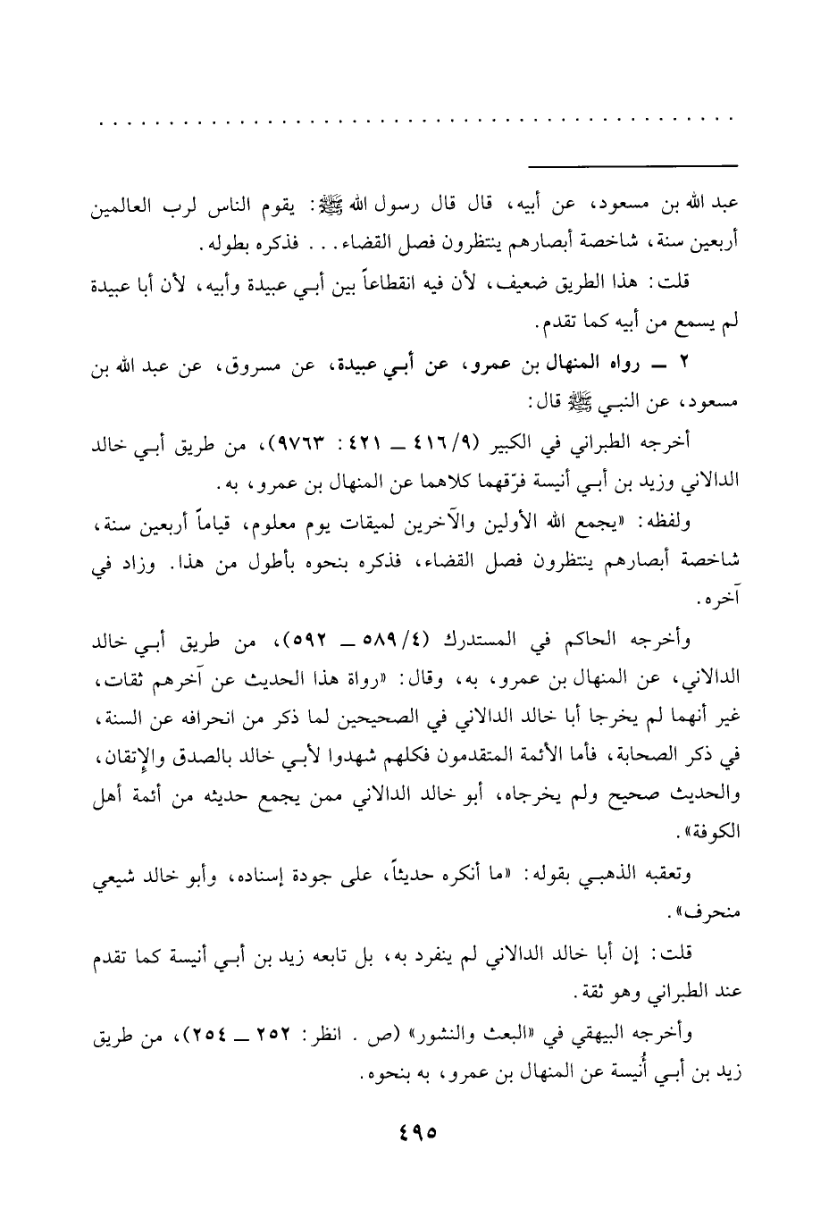 2 - رواه المنهال بن عمرو، عن أبي عبيدة، عَنْ مَسْرُوقٍ، عَنْ عَبْدِ اللَّهِ بْنِ مَسْعُودٍ، عَنِ النَّبِيِّ -صَلَّى اللَّهُ عَلَيْهِ وَسَلَّمَ- قَالَ: