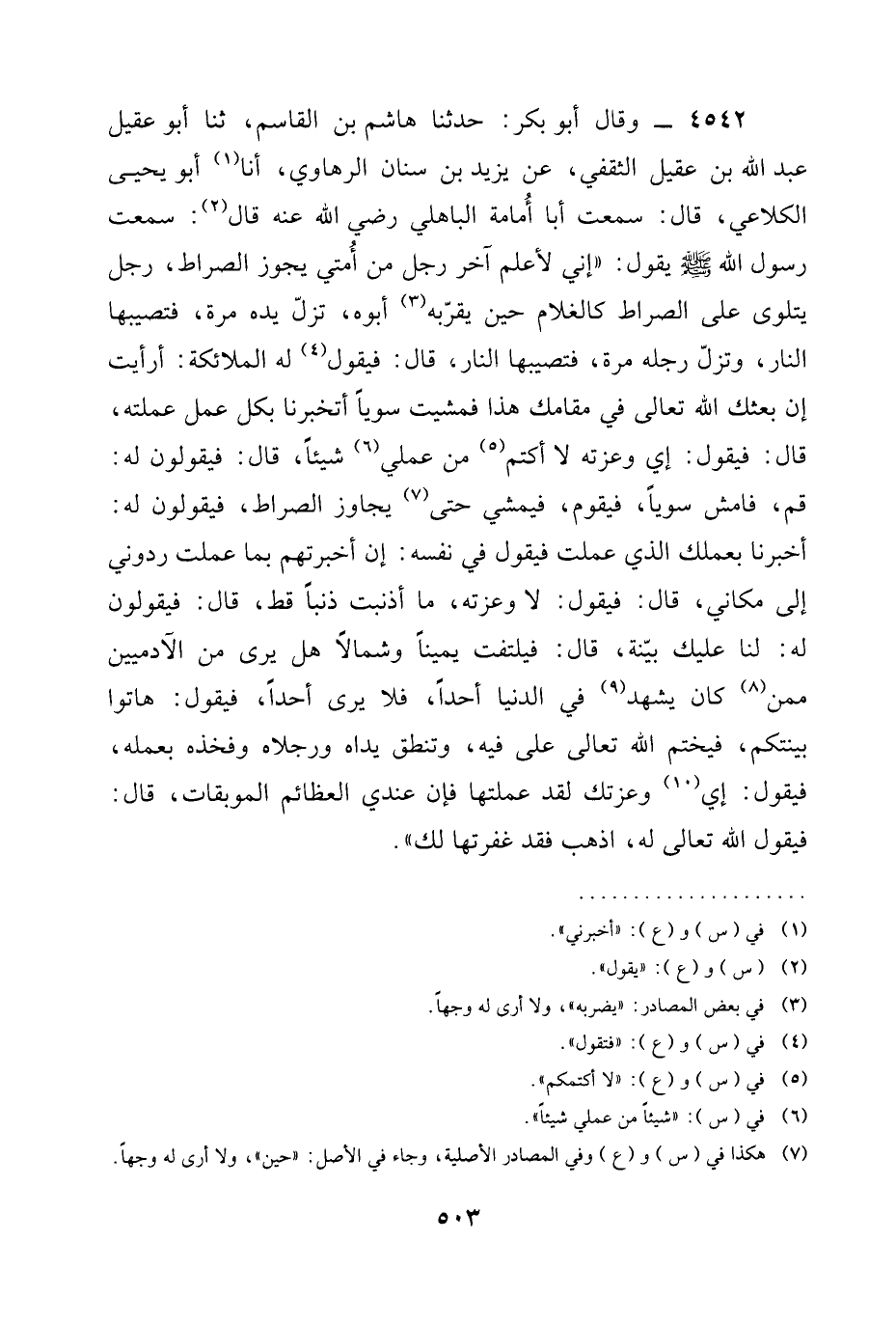4542 - وَقَالَ أَبُو بَكْرٍ: حَدَّثَنَا هَاشِمُ بْنُ الْقَاسِمِ، ثنا أَبُو عَقِيلٍ عَبْدُ اللَّهِ بْنُ عَقِيلٍ الثَّقَفِيُّ، عَنْ يَزِيدَ بْنِ سِنَانٍ الرهاوي، أنا أَبُو يَحْيَى الْكَلَاعِيُّ، قَالَ: سَمِعْتُ أَبَا أُمَامَةَ الْبَاهِلِيَّ رَضِيَ الله عَنْه قَالَ: سَمِعْتُ رَسُولَ اللَّهِ صَلَّى اللَّهُ عَلَيْهِ وَسَلَّمَ يَقُولُ: " إِنِّي §لَأَعْلَمُ آخِرَ رَجُلٍ مِنْ أُمَّتِي يَجُوزُ الصِّرَاطَ، رَجُلٌ يَتَلَوَّى عَلَى الصِّرَاطِ كَالْغُلَامِ حِينَ يُقَرِّبُهُ أَبُوهُ، تَزِلُّ يَدُهُ مَرَّةً، فَتُصِيبُهَا النَّارُ، وَتَزِلُّ رِجْلُهُ مَرَّةً، فَتُصِيبُهَا النَّارُ، قَالَ: فيقول لَهُ الْمَلَائِكَةُ: أَرَأَيْتَ إِنْ بعثك الله تعالى في مَقَامِكَ هَذَا فَمَشَيْتَ سَوِيًّا أَتُخْبِرُنَا بِكُلِّ عَمَلٍ عَمِلْتَهُ، قَالَ: فَيَقُولُ: إِي وَعِزَّتِهِ لَا أَكْتُمُ مِنْ عَمَلِي شَيْئًا، قَالَ: فَيَقُولُونَ لَهُ: قُمْ، فَامْشِ سَوِيًّا، فَيَقُومُ، فَيَمْشِي حَتَّى يُجَاوِزَ الصِّرَاطَ، فَيَقُولُونَ لَهُ: أَخْبِرْنَا بِعَمَلِكَ الَّذِي عَمِلْتَ فَيَقُولُ فِي نَفْسِهِ: إِنْ أَخْبَرْتُهُمْ بِمَا عَمِلْتُ رُدُّونِي إِلَى مَكَانِي، قال: فَيَقُولُ: لَا وَعِزَّتِهِ، مَا أَذْنَبْتُ ذَنْبًا قَطُّ، قَالَ: فَيَقُولُونَ لَهُ: لَنَا عَلَيْكَ بَيِّنَةٌ، قَالَ: فَيَلْتَفِتُ يَمِينًا وَشِمَالًا هَلْ يَرَى مِنَ الْآدَمِيِّينَ ممن كان يشهد فِي الدُّنْيَا أَحَدًا، فَلَا يَرَى أَحَدًا، فَيَقُولُ: هَاتُوا بَيِّنَتَكُمْ، فيختم الله تعالى فِيهِ، وَتَنْطِقُ يَدَاهُ وَرِجْلَاهُ وفخذه بِعَمَلِهِ، فَيَقُولُ: إِي وَعِزَّتِكَ لَقَدْ عَمِلْتُهَا فَإِنَّ عِنْدِي الْعَظَائِمُ الْمُوبِقَاتُ، قَالَ: فيقول الله تعالى لَهُ، اذْهَبْ فَقَدْ غَفَرْتُهَا لَكَ ".