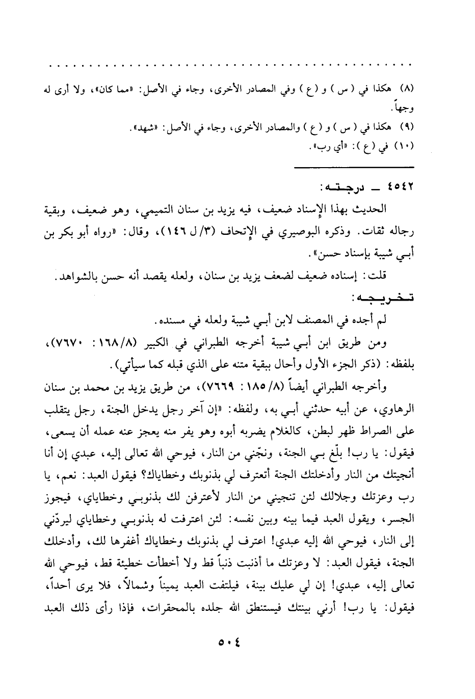 ومن طريق ابن أبي شيبة أخرجه الطبراني في الكبير (8/ 168: 7670)، بلفظه: (ذكر الجزء الأول وأحال ببقية متنه على الذي قبله كما سيأتي). وأخرجه الطبراني أيضًا (8/ 185: 7669)، من طريق يزيد بن محمَّد بن سنان الرهاوي، عن أبيه حدَّثني أبي به، ولفظه: "إن آخر رجل يدخل الجنة، رجل يتقلب على الصراط ظهر لبطن، كالغلام يضربه أبوه وهو يفر منه يعجز عنه عمله أن يسعى، فيقول: يا رب! بلّغ بي الجنة، ونجّني من النار، فيوحي الله تعالى إليه، عبدي إن أنا أنجيتك من النار وأدخلتك الجنة أتعترف لي بذنوبك وخطاياك؟ فيقول العبد: نعم، يا رب وعزتك وجلالك لئن تنجيني من النار لأعترفن لك بذنوبي وخطاياي، فيجوز الجسر، ويقول العبد فيما بينه وبين نفسه: لئن اعترفت له بذنوبي وخطاياي ليردّني إلى النار، فيوحي الله إليه عبدي! اعترف لي بذنوبك وخطاياك أغفرها لك، وأدخلك الجنة، فيقول العبد: لا وعزتك ما أذنبت ذنبًا قط ولا أخطأت خطيئة قط، فيوحي الله تعالى إليه، عبدي! إن لي عليك بينة، فيلتفت العبد يمينًا وشمالًا، فلا يرى أحدًا، فيقول: يا رب! أرني بينتك فيستنطق الله جلده بالمحقرات، فإذا رأى ذلك العبد =