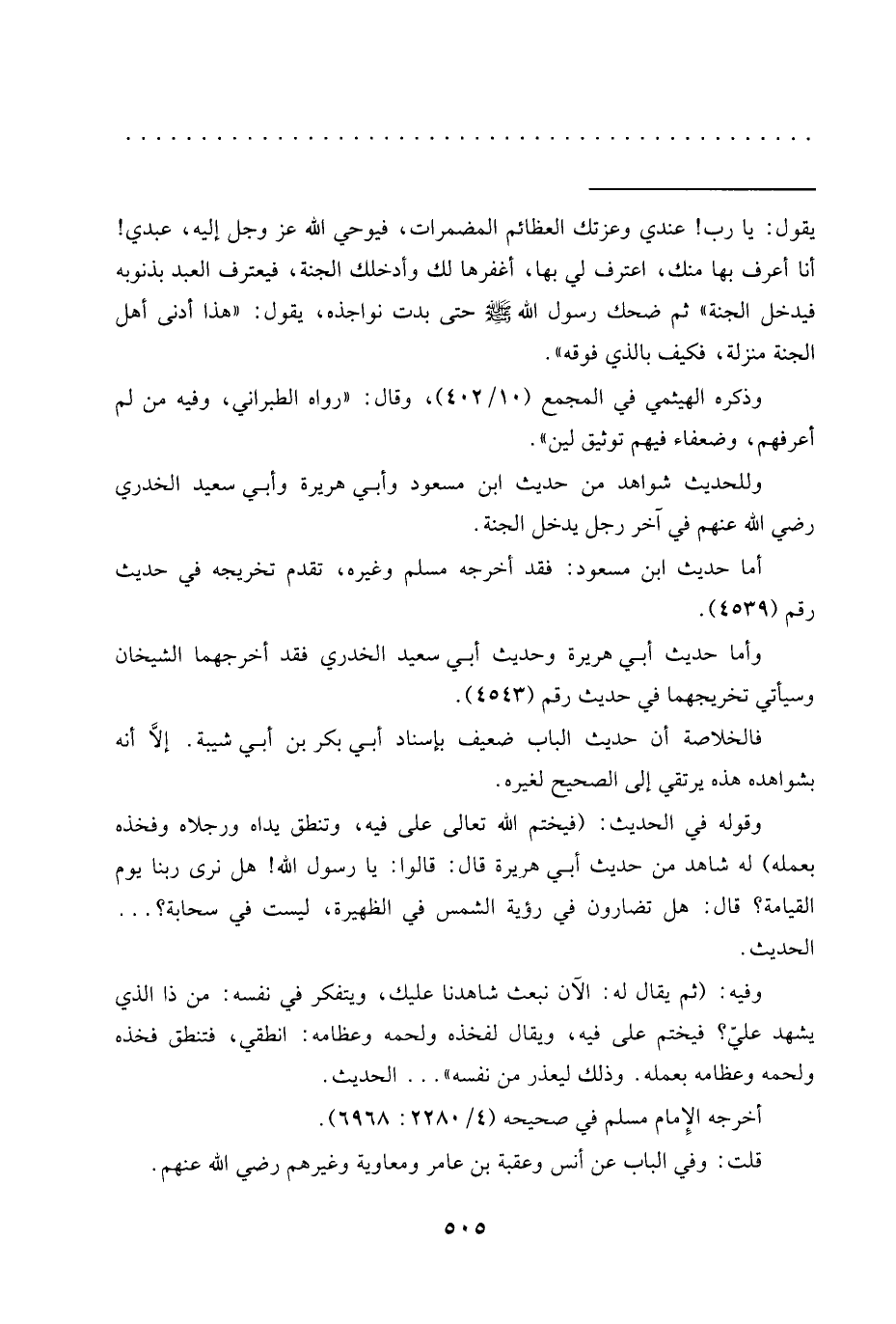 = يقول: يا رب! عندي وعزتك العظائم المضمرات، فيوحي الله عَزَّ وَجَلَّ إليه، عبدي! أنا أعرف بها منك، اعترف لي بها، أغفرها لك وأدخلك الجنة، فيعترف العبد بذنوبه فيدخل الجنة" ثم ضحك رسول الله -صلى الله عليه وسلم- حتى بدت نواجذه، يقول: "هذا أدنى أهل الجنة منزلة، فكيف بالذي فوقه".