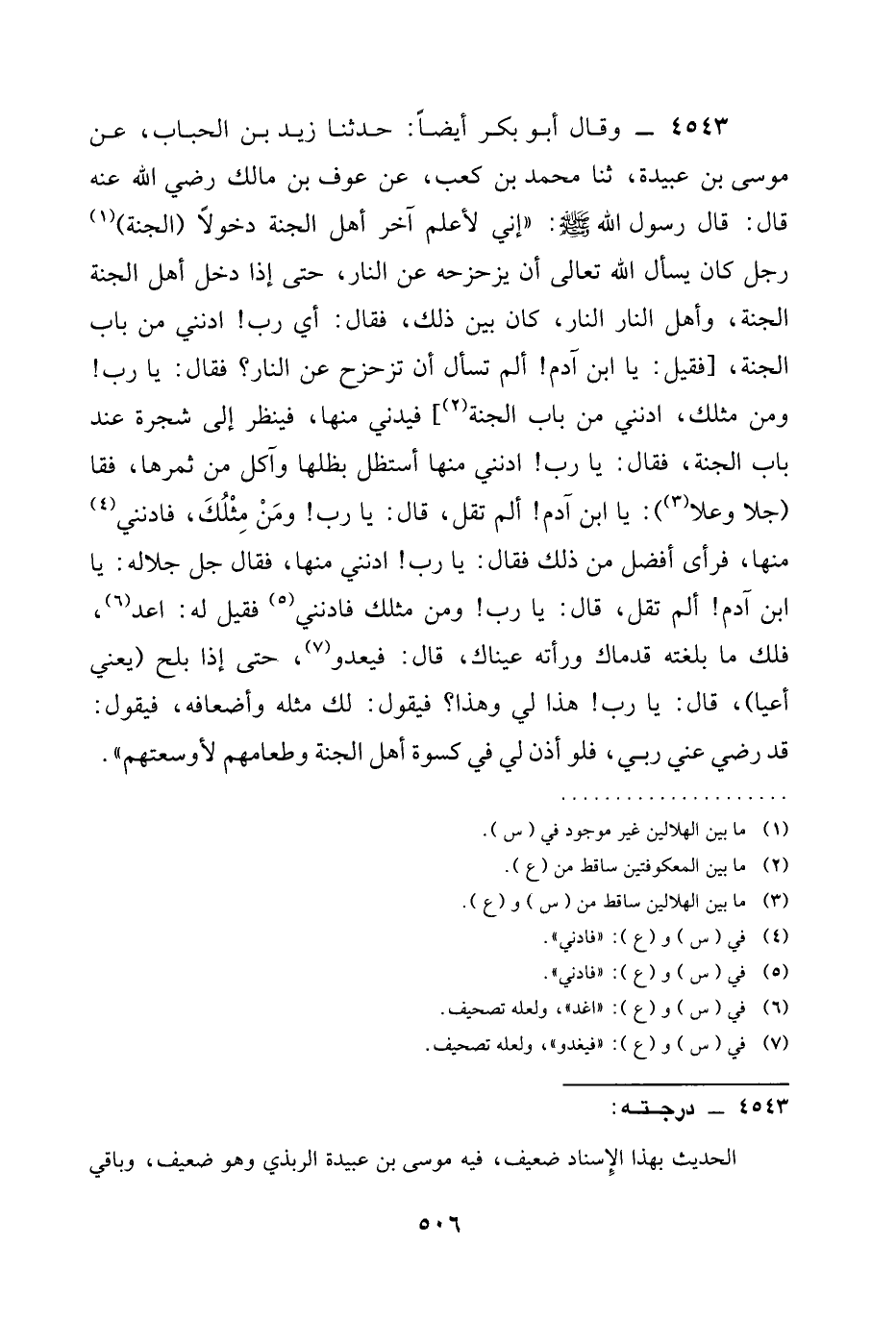 4543 - وَقَالَ أَبُو بَكْرٍ أَيْضًا: حَدَّثَنَا زَيْدُ بْنُ الْحُبَابِ، عَنْ مُوسَى بْنِ عُبَيْدَةَ، ثنا مُحَمَّدُ بْنُ كَعْبٍ، عَنْ عَوْفِ بْنِ مَالِكٍ رَضِيَ الله عَنْه قَالَ: قَالَ رَسُولُ اللَّهِ صَلَّى اللَّهُ عَلَيْهِ وَسَلَّمَ: " إِنِّي §لَأَعْلَمُ آخِرَ أَهْلِ الْجَنَّةِ دُخُولًا (الْجَنَّةَ) رَجُلٌ كَانَ يسأل الله تعالى أَنْ يُزَحْزِحَهُ عَنِ النَّارِ، حَتَّى إِذَا دَخَلَ أَهْلُ الْجَنَّةِ الْجَنَّةَ، وَأَهْلُ النَّارِ النَّارَ، كَانَ بَيْنَ ذَلِكَ، فَقَالَ: أَيْ رَبِّ! أَدْنِنِي مِنْ بَابِ الْجَنَّةِ، [فَقِيلَ: يَا ابْنَ آدَمَ! أَلَمْ تَسْأَلْ أَنْ تُزَحْزَحَ عَنِ النَّارِ؟ فَقَالَ: يَا رَبِّ! وَمَنْ مِثْلُكَ، ادنني مِنْ بَابِ الْجَنَّةِ] فَيُدْنَى مِنْهَا، فَيَنْظُرُ إِلَى شَجَرَةٍ عِنْدَ بَابِ الْجَنَّةِ، فَقَالَ: يَا رَبِّ! أَدْنِنِي مِنْهَا أَسْتَظِلُّ بِظِلِّهَا وَآكُلُ مِنْ ثمرها، فقال (جلا وعلا) : يَا ابْنَ آدَمَ! أَلَمْ تَقُلْ، قَالَ: يَا رَبِّ! وَمَنْ مِثْلُكَ، فَأَدْنِنِي مِنْهَا، فَرَأَى أَفْضَلَ مِنْ ذَلِكَ فَقَالَ: يَا رَبِّ! أَدْنِنِي منها، فقال جل جلاله: يَا ابْنَ آدَمَ! أَلَمْ تَقُلْ، قَالَ: يَا رَبِّ! وَمَنْ مِثْلُكَ فَأَدْنِنِي فَقِيلَ لَهُ: اعْدُ، فَلَكَ مَا بَلَغَتْهُ قَدَمَاكَ وَرَأَتْهُ عَيْنَاكَ، قَالَ: فَيَعْدُو، حَتَّى إِذَا بَلَّحَ (يَعْنِي أَعْيَا) ، قَالَ: يَا رَبِّ! هَذَا لِي وَهَذَا؟ فَيَقُولُ: لَكَ مِثْلَهُ وَأَضْعَافَهُ، فَيَقُولُ: قَدْ رضي عني رَبِّي، فَلَوْ أَذِنَ لِي فِي كِسْوَةِ أَهْلِ الْجَنَّةِ وطعامهم لَأَوْسَعْتُهُمْ ".