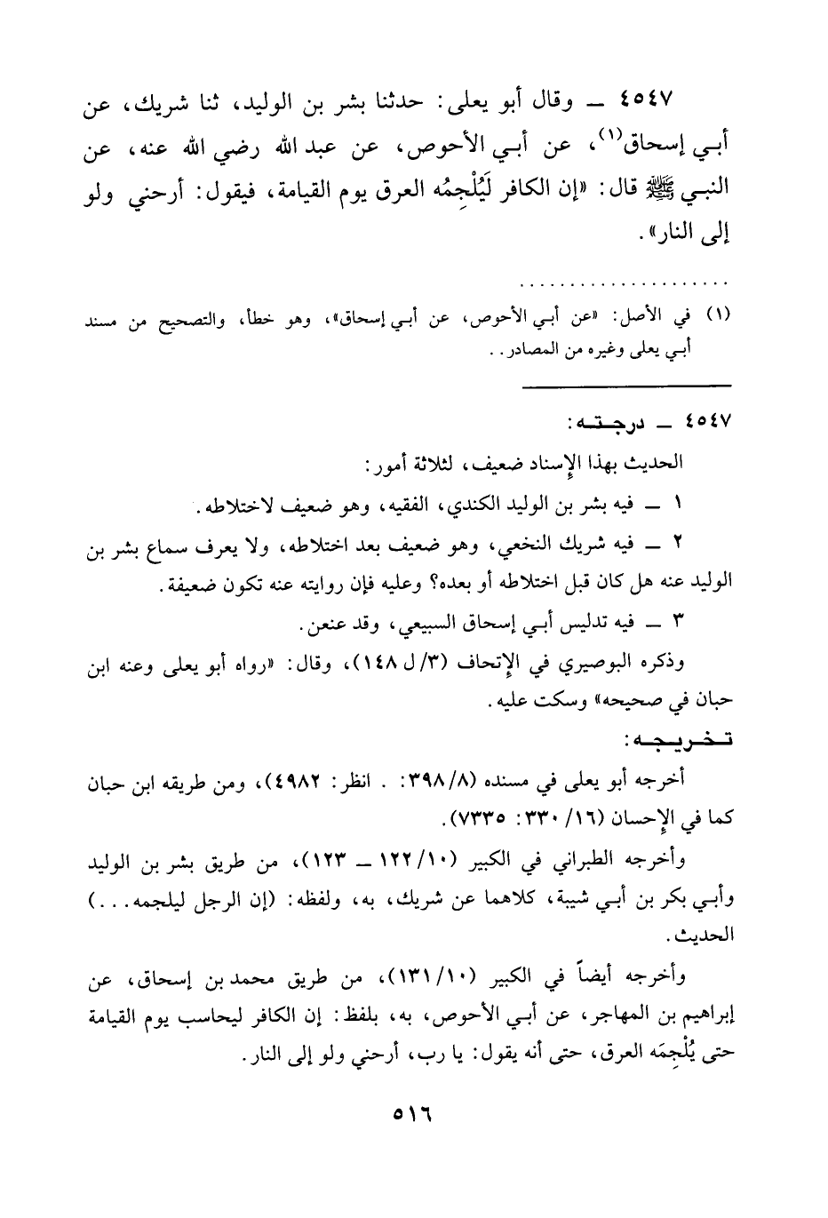 4547 - وَقَالَ أَبُو يَعْلَى: حَدَّثَنَا بِشْرُ بْنُ الْوَلِيدِ، ثنا شَرِيكٌ، عَنْ أَبِي إِسْحَاقَ، عَنْ أَبِي الْأَحْوَصِ، عَنْ عَبْدِ اللَّهِ رَضِيَ الله عَنْه، عَنِ النَّبِيِّ صَلَّى اللَّهُ عَلَيْهِ وَسَلَّمَ قَالَ: " إِنَّ §الْكَافِرَ لَيُلْجِمُهُ الْعَرَقُ يَوْمَ الْقِيَامَةِ، فَيَقُولُ: أَرِحْنِي وَلَوْ إِلَى النَّارِ ".