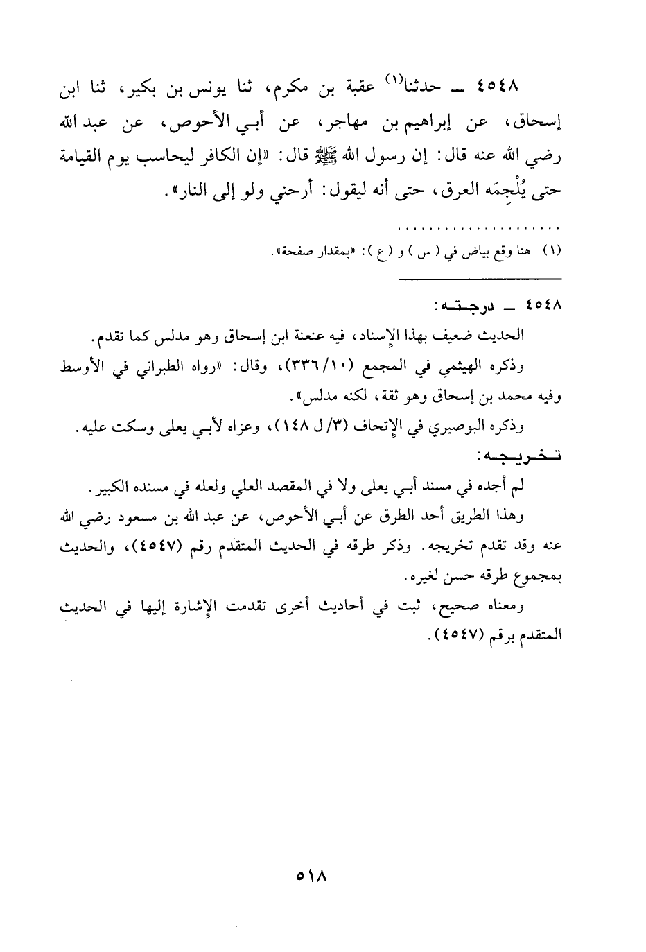 4548 - حَدَّثَنَا عُقْبَةُ بْنُ مُكْرَمٍ، ثنا يُونُسُ بْنُ بُكَيْرٍ، ثنا ابْنُ إِسْحَاقَ، عَنْ إِبْرَاهِيمَ بْنِ مُهَاجِرٍ، عَنْ أَبِي الْأَحْوَصِ، عَنْ عَبْدِ اللَّهِ رَضِيَ الله عَنْه قَالَ: إِنَّ رَسُولَ اللَّهِ صَلَّى اللَّهُ عَلَيْهِ وَسَلَّمَ قَالَ: " إِنَّ §الْكَافِرَ لَيُحَاسَبُ يَوْمَ الْقِيَامَةِ حَتَّى يُلْجِمَهُ الْعَرَقُ، حَتَّى إِنَّهُ لَيَقُولُ: أَرِحْنِي وَلَوْ إِلَى النَّارِ ".