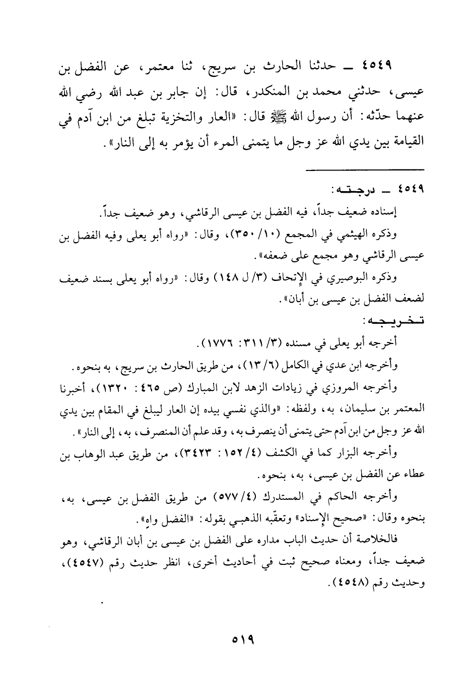 4549 - حَدَّثَنَا الْحَارِثُ بْنُ سُرَيْجٍ، ثنا مُعْتَمِرٌ، عَنِ الْفَضْلِ بْنِ عِيسَى، حَدَّثَنِي مُحَمَّدُ بْنُ الْمُنْكَدِرِ، قَالَ: إِنَّ جَابِرَ بْنَ عَبْدِ الله رَضِيَ الله عَنْهما حَدَّثَهُ: أَنَّ رَسُولَ اللَّهِ صَلَّى اللَّهُ عَلَيْهِ وَسَلَّمَ قَالَ: " §الْعَارُ وَالتَّخْزِيَةُ تَبْلُغُ مِنَ ابْنِ آدَمَ فِي الْقِيَامَةِ بَيْنَ يدي الله عز وجل مَا يَتَمَنَّى المرء أَنْ يُؤْمَرَ بِهِ إِلَى النَّارِ ".