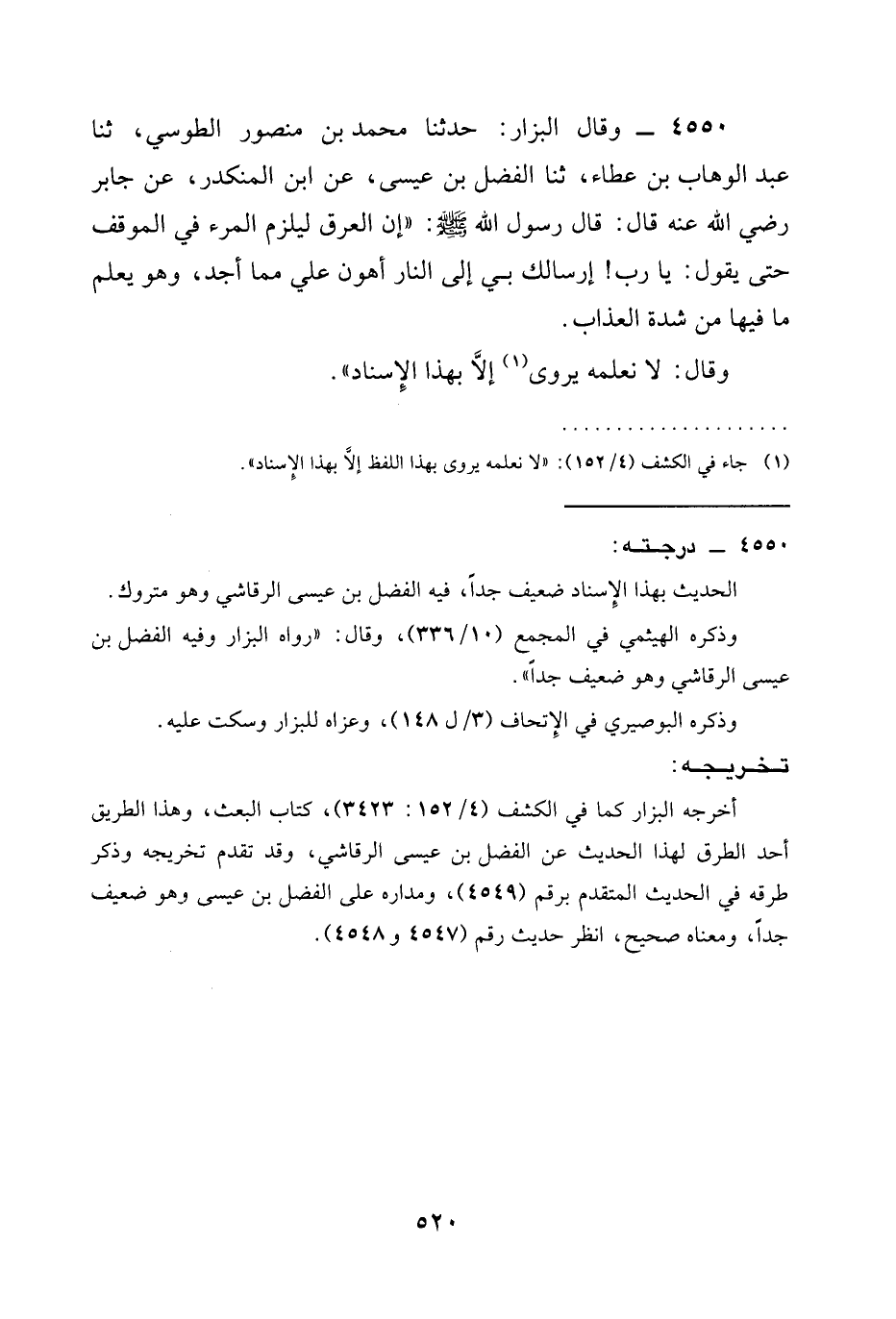 4550 - وَقَالَ الْبَزَّارُ: حَدَّثَنَا مُحَمَّدُ بْنُ مَنْصُورٍ الطُّوسِيُّ، ثنا عَبْدُ الْوَهَّابِ بْنُ عَطَاءٍ، ثنا الْفَضْلُ بْنُ عِيسَى، عَنِ ابْنِ الْمُنْكَدِرِ، عَنْ جَابِرٍ رَضِيَ الله عَنْه قَالَ: قَالَ رَسُولُ اللَّهِ صَلَّى اللَّهُ عَلَيْهِ وَسَلَّمَ: " إِنَّ §الْعَرَقَ لَيَلْزَمُ الْمَرْءَ فِي الْمَوْقِفِ حَتَّى يَقُولَ: يَا رَبِّ! إِرْسَالُكَ بِي إِلَى النَّارِ أَهْوَنُ عَلَيَّ مِمَّا أَجِدُ، وَهُوَ يَعْلَمُ مَا فِيهَا مِنْ شِدَّةِ الْعَذَابِ.