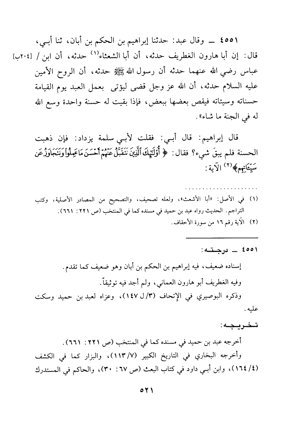 4551 - وَقَالَ عَبْدُ: حَدَّثَنَا إِبْرَاهِيمُ بْنُ الْحَكَمِ بْنِ أَبَانَ، ثنا أَبِي، قَالَ: إِنَّ أَبَا هَارُونَ الْغِطْرِيفِ حَدَّثَهُ، أَنَّ أَبَا الشعثاء حَدَّثَهُ، أَنَّ ابن عباس رَضِيَ الله عَنْهما حَدَّثَهُ أَنَّ رَسُولَ اللَّهِ صَلَّى اللَّهُ عَلَيْهِ وَسَلَّمَ حَدَّثَهُ، أَنَّ الروح الأمين عليه السلام حَدَّثَهُ، أن الله عز وجل قَضَى §لَيُؤْتَى بِعَمَلِ الْعَبْدِ يَوْمَ الْقِيَامَةِ حسناته وسيئاته فيقص بَعْضُهَا بِبَعْضٍ، فَإِذَا بَقِيَتْ لَهُ حَسَنَةٌ وَاحِدَةٌ وَسَّعَ اللَّهُ لَهُ فِي الْجَنَّةِ مَا شَاءَ ".