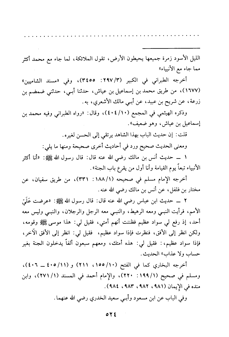 = الليل الأسود زمرة جميعها يحيطون الأرض، تقول الملائكة، لما جاء مع محمَّد أكثر مما جاء مع الأنبياء" أخرجه الطبراني في الكبير (3/ 297: 3455)، وفي "مسند الشاميين" (1677)، من طريق محمَّد بن إسماعيل بن عياش، حدَّثنا أبي، حدَّثني ضمضم بن زرعة، عن شريح بن عبيد، عن أبي مالك الأشعري، به.