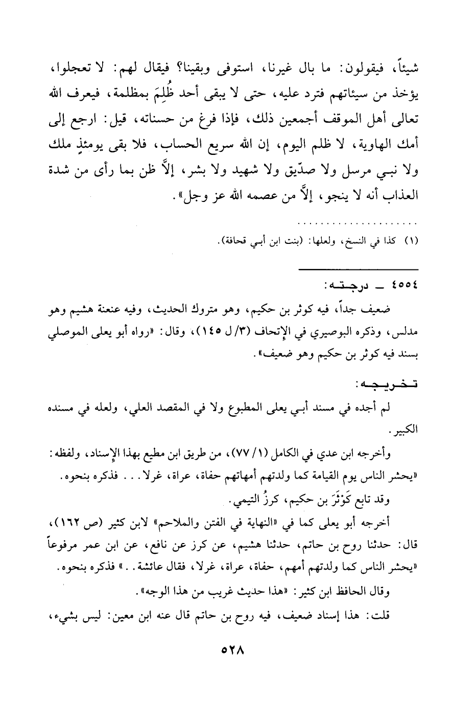 أخرجه أبو يعلى كما في "النهاية في الفتن والملاحم" لابن كثير (ص 162)، قال: حدَّثنا روح بن حاتم، حدَّثنا هشيم، عن كرز عن نافع، عن ابن عمر مرفوعًا "يحشر الناس كما ولدتهم أمهم، حفاة، عراة، غرلا، فقال عائشة .. " فذكره بنحوه.