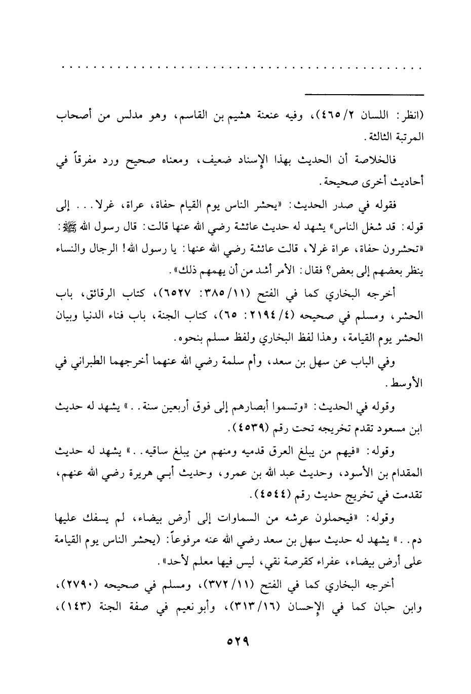أخرجه البخاري كما في الفتح (11/ 385: 6527)، كتاب الرقائق، باب الحشر، ومسلم في صحيحه (4/ 2194: 65)، كتاب الجنة، باب فناء الدنيا وبيان الحشر يوم القيامة، وهذا لفظ البخاري ولفظ مسلم بنحوه.