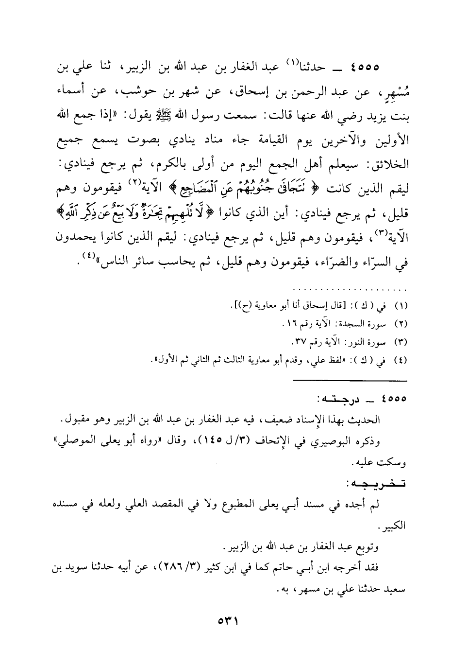 4555 - حَدَّثَنَا عَبْدُ الْغَفَّارِ بْنُ عَبْدِ اللَّهِ بْنِ الزُّبَيْرِ، ثنا عَلِيُّ بْنُ مُسْهِرٍ، عَنْ عَبْدِ الرَّحْمَنِ بْنِ إِسْحَاقَ، عَنْ شَهْرِ بْنِ حَوْشَبٍ، عَنْ أَسْمَاءَ بنت يزيد رَضِيَ الله عَنْها قَالَتْ: سَمِعْتُ رَسُولَ اللَّهِ صَلَّى اللَّهُ عَلَيْهِ وَسَلَّمَ يَقُولُ: " §إِذَا جَمَعَ اللَّهُ الْأَوَّلِينَ وَالْآخِرِينَ يَوْمَ الْقِيَامَةِ جَاءَ مُنَادٍ يُنَادِي بِصَوْتٍ يُسْمِعُ جَمِيعَ الْخَلَائِقِ: سَيَعْلَمُ أَهْلُ الْجَمْعِ الْيَوْمَ مَنْ أَوْلَى بِالْكَرَمِ، ثُمَّ يَرْجِعُ فَيُنَادِي: لِيَقُمِ الَّذِينَ كَانَتْ {تَتَجَافَى جُنُوبُهُمْ عَنِ الْمَضَاجِعِ} الْآيَةَ فَيَقُومُونَ وَهُمْ قَلِيلٌ، ثُمَّ يَرْجِعُ فينادي: أين الذي كَانُوا {لَا تُلْهِيهِمْ تِجَارَةٌ وَلَا بَيْعٌ عَنْ ذِكْرِ اللَّهِ} الْآيَةَ، فَيَقُومُونَ وَهُمْ قَلِيلٌ، ثُمَّ يَرْجِعُ فَيُنَادِي: لِيَقُمِ الَّذِينَ كَانُوا يَحْمَدُونَ فِي السَّرَّاءِ وَالضَّرَّاءِ، فَيَقُومُونَ وَهُمْ قَلِيلٌ، ثُمَّ يُحَاسَبُ سَائِرُ النَّاسِ ".