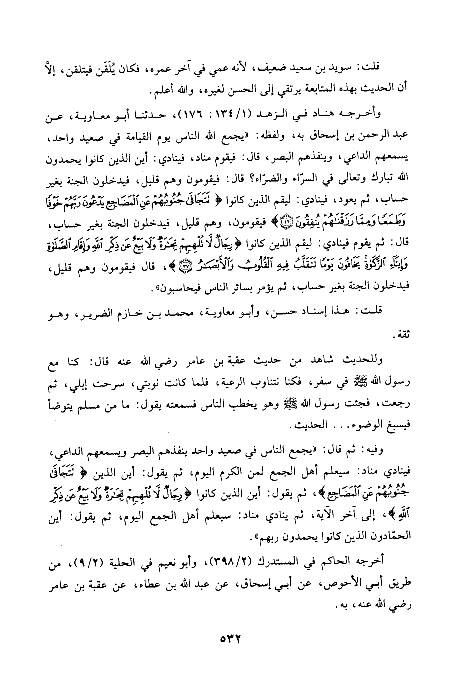 وأخرجه هنَّاد في الزهد (1/ 134: 176)، حدَّثنا أَبُو مُعَاوِيَةَ، عَنْ عَبْدِ الرَّحْمَنِ بْنِ إسحاق به، ولفظه: "يَجْمَعُ اللَّهُ النَّاسَ يَوْمَ الْقِيَامَةِ فِي صَعِيدٍ واحد، يسمعهم الداعي، وينفذهم البصر، قال: فيقوم مناد، فينادي: أين الذين كانوا يحمدون الله تبارك وتعالى في السرّاء والضرّاء؟ قال: فيقومون وهم قليل، فيدخلون الجنة بغير حساب، ثم يعود، ينادي: ليقم الذين كانو ا {تَتَجَافَى جُنُوبُهُمْ عَنِ الْمَضَاجِعِ يَدْعُونَ رَبَّهُمْ خَوْفًا وَطَمَعًا وَمِمَّا رَزَقْنَاهُمْ يُنْفِقُونَ (16)} فيقومون، وهم قليل، فيدخلون الجنة بغير حساب، قال: ثم يقوم ينادي: ليقم الذين كانوا {رِجَالٌ لَا تُلْهِيهِمْ تِجَارَةٌ وَلَا بَيْعٌ عَنْ ذِكْرِ اللَّهِ وَإِقَامِ الصَّلَاةِ وَإِيتَاءِ الزَّكَاةِ يَخَافُونَ يَوْمًا تَتَقَلَّبُ فِيهِ الْقُلُوبُ وَالْأَبْصَارُ (37)} قال فيقومون وهم قليل، فيدخلون الجنة بغير حساب، ثم يؤمر بسائر الناس فيحاسبون!.