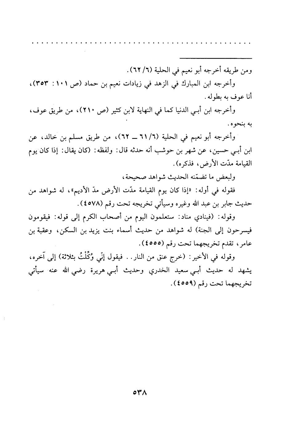 ولبعض ما تضمّنه الحديث شواهد صحيحة، فقوله في أوله: "إِذَا كَانَ يَوْمُ الْقِيَامَةِ مُدَّتِ الْأَرْضُ مَدَّ الأديم"، له شواهد من حديث جابر بن عبد الله وغيره وسيأتي تخريجه تحت رقم (4578).