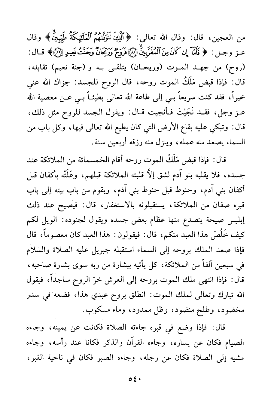 من العجين، قال: وقال الله تعالى: {الَّذِينَ تَتَوَفَّاهُمُ الْمَلَائِكَةُ طَيِّبِينَ} وقال عزَّ وجلَّ: {فَأَمَّا إِنْ كَانَ مِنَ الْمُقَرَّبِينَ (88) فَرَوْحٌ وَرَيْحَانٌ وَجَنَّتُ نَعِيمٍ (89)} قَالَ: (رَوْحٌ) مِنْ جَهْدِ الْمَوْتِ (وَرَيْحَانٌ) يُتَلَقَّى به و (جنة نَعِيمٍ) تُقَابِلُهُ، قَالَ: فَإِذَا قَبَضَ مَلَكُ الْمَوْتِ رُوحَهُ، قَالَ الرُّوحُ لِلْجَسَدِ: جَزَاكَ اللَّهُ عَنِّي خَيْرًا، فَقَدْ كُنْتَ سَرِيعًا بِي إِلَى طَاعَةِ الله تعالى بطيئًا بي عن معصية الله عزَّ وجلَّ، فقد نَجَيْتَ فأنجيت قَالَ: وَيَقُولُ الْجَسَدُ لِلرُّوحِ مِثْلَ ذَلِكَ، قَالَ: وَتَبْكِي عَلَيْهِ بِقَاعُ الْأَرْضِ الَّتِي كَانَ يُطِيعُ الله تعالى فِيهَا، وَكُلُّ بَابٍ مِنَ السَّمَاءِ يَصْعَدُ مِنْهُ عمله، وينزل مِنْهُ رِزْقُهُ أَرْبَعِينَ سَنَةً.