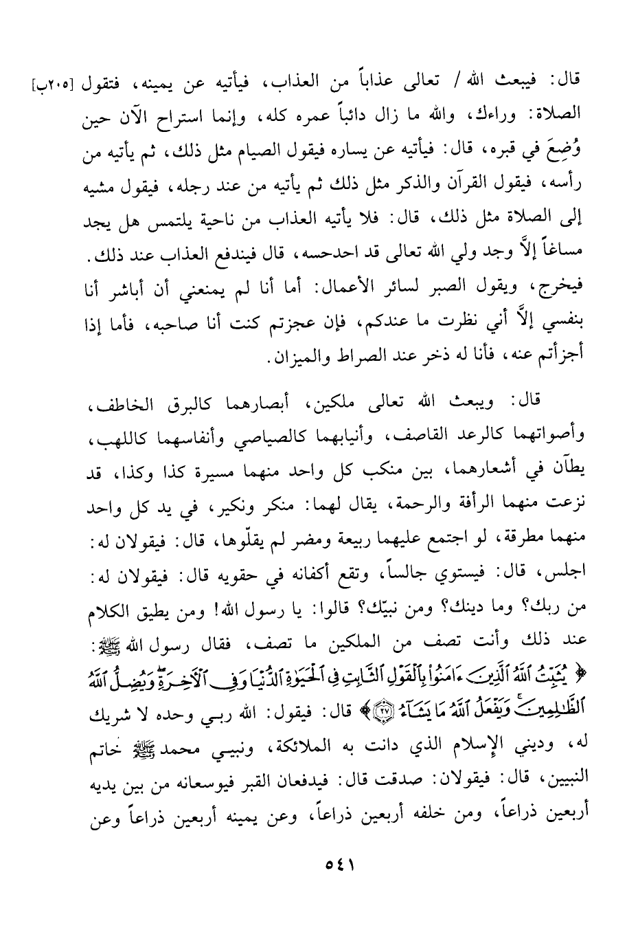 قَالَ: وَيَبْعَثُ اللَّهُ تَعَالَى مَلَكَيْنِ، أَبْصَارُهُمَا كَالْبَرْقِ الْخَاطِفِ، وَأَصْوَاتُهُمَا كَالرَّعْدِ الْقَاصِفِ، وَأَنْيَابُهُمَا كَالصَّيَاصِي وَأَنْفَاسُهُمَا كَاللَّهَبِ، يَطَآنِ فِي أَشْعَارِهِمَا، بَيْنَ مَنْكِبِ كُلِّ وَاحِدٍ مِنْهُمَا مَسِيرَةُ كَذَا وَكَذَا، قَدْ نُزِعَتْ مِنْهُمَا الرَّأْفَةُ وَالرَّحْمَةُ، يُقَالَ لَهُمَا: مُنْكَرٌ وَنَكِيرٌ، فِي يَدِ كُلِّ وَاحِدٍ منهما مطرقة، لو اجتمع عليهما ربيعة ومضر لم يقلوها، قال: فيقولان له: اجْلِسْ، قَالَ: فَيَسْتَوِي جَالِسًا، وَتَقَعُ أَكْفَانُهُ فِي حِقْوَيْهِ قَالَ: فَيَقُولَانِ لَهُ: مَنْ رَبُّكَ؟ وَمَا دينك؟ ومن نبيّك؟ قَالُوا: يَا رَسُولَ اللَّهِ -صَلَّى اللَّهُ عَلَيْهِ وَسَلَّمَ-! وَمَنْ يُطِيقُ الْكَلَامَ عِنْدَ ذَلِكَ وَأَنْتَ تَصِفُ مِنَ الْمَلَكَيْنِ مَا تَصِفُ، فَقَالَ رَسُولُ اللَّهِ -صَلَّى اللَّهُ عَلَيْهِ وَسَلَّمَ-: {يُثَبِّتُ اللَّهُ الَّذِينَ آمَنُوا بِالْقَوْلِ الثَّابِتِ فِي الْحَيَاةِ الدُّنْيَا وَفِي الْآخِرَةِ وَيُضِلُّ اللَّهُ الظَّالِمِينَ وَيَفْعَلُ اللَّهُ مَا يَشَاءُ (27)} قَالَ: فَيَقُولُ: اللَّهُ رَبِّي وَحْدَهُ لَا شَرِيكَ لَهُ، وَدِينِيَ الإِسلام الَّذِي دَانَتْ بِهِ الْمَلَائِكَةُ، ونبيي محمَّد -صلى الله عليه وسلم- خاتم النبيين، قال: فيقولان: صَدَقْتَ قَالَ: فَيَدْفَعَانِ الْقَبْرَ فَيُوَسِّعَانِهِ مِنْ بَيْنِ يَدَيْهِ أَرْبَعِينَ ذِرَاعًا، وَمِنْ خَلْفِهِ أَرْبَعِينَ ذِرَاعًا، وَعَنْ يَمِينِهِ أَرْبَعِينَ ذِرَاعًا وَعَنْ