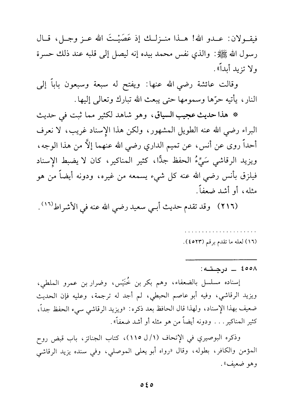 *هَذَا حَدِيثٌ عَجِيبُ السِّيَاقِ، وَهُوَ شَاهِدٌ لِكَثِيرٍ مِمَّا ثَبَتَ فِي حديث البراء رضي الله عنه الطويل المشهور، ولكن هذا الإِسناد غريب، لَا نَعْرِفُ أَحَدًا رَوَى عَنْ أَنَسٍ، عَنْ تميم الداري رضي الله عنهما إلَّا من هذا الوجه، ويزيد الرقاشي سَيِّءُ الْحِفْظِ جِدًّا، كَثِيرُ الْمَنَاكِيرِ، كَانَ لَا يَضْبُطُ الإِسناد فيلزق بأنس رضي الله عنه كُلَّ شَيْءٍ يَسْمَعُهُ مِنْ غَيْرِهِ، وَدُونَهُ أَيْضًا مَنْ هُوَ مِثْلَهُ، أَوْ أَشَدَّ ضَعْفًا.