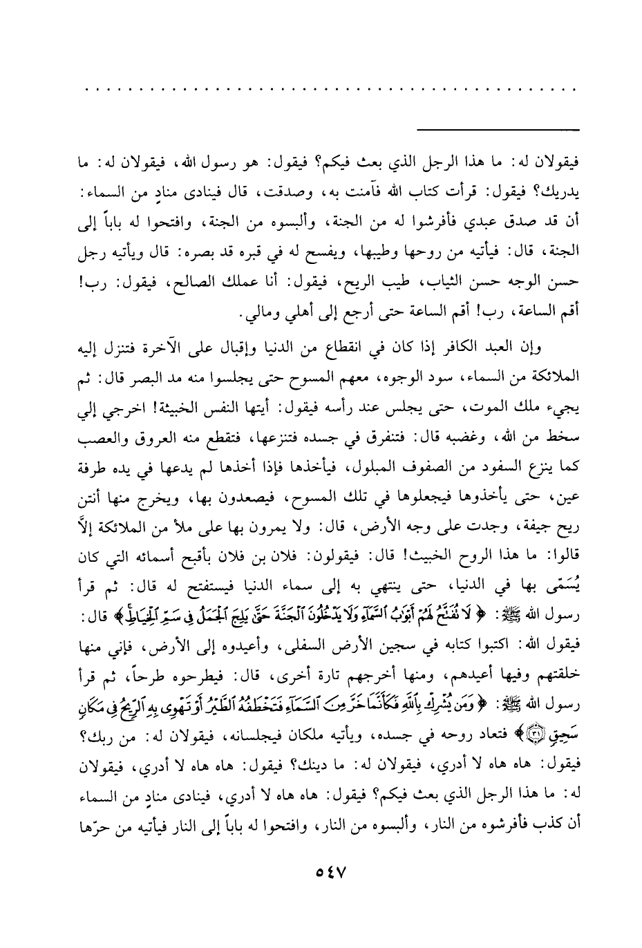 = فيقولان له: ما هذا الرجل الذي بعث فيكم؟ فيقول: هو رسول الله -صلى الله عليه وسلم-، فيقولان له: ما يدريك؟ فيقول: قرأت كتاب الله فآمنت به، وصدقت، قال فينادى منادٍ من السماء: أن قد صدق عبدي فأفرشوا له من الجنة، وألبسوه من الجنة، وافتحوا له بابًا إلى الجنة، قال: فيأتيه من روحها وطيبها، ويفسح له في قبره قد بصره: قال ويأتيه رجل حسن الوجه حسن الثياب، طيب الريح، فيقول: أنا عملك الصالح، فيقول: رب! أقم الساعة، رب! أقم الساعة حتى أرجح إلى أهلي ومالي. وإن العبد الكافر إذا كان في انقطاع من الدنيا وإقبال على الآخرة فتنزل إليه الملائكة من السماء، سود الوجوه، معهم المسوح حتى يجلسوا منه مد البصر قال: ثم يجيء ملك الموت، حتى يجلس عند رأسه فيقول: أيتها النفس الخبيثة! اخرجي إلى سخط من الله، وغضبه قال: فتنفرق في جسده فتنزعها، فتقطع منه العروق والعصب كما ينزع السفود من الصوف المبلول، فيأخذها فإذا أخذها لم يدعها في يده طرفة عين، حتى يأخذوها فيجعلوها في تلك المسوح، فيصعدون بها، ويخرج منها أنتن ريح جيفة، وجدت على وجه الأرض، قال: ولا يمرون بها على ملأ من الملائكة إلَّا قالوا: ما هذا الروح الخبيث! قال: فيقولون: فلان بن فلان بأقبح أسمائه التي كان يُسَمّى بها في الدنيا، حتى ينتهي به إلى سماء الدنيا فيستفتح له قال: ثُمَّ قَرَأَ رَسُولُ اللَّهِ -صَلَّى اللَّهُ عَلَيْهِ وَسَلَّمَ-: {لَا تُفَتَّحُ لَهُمْ أَبْوَابُ السَّمَاءِ وَلَا يَدْخُلُونَ الْجَنَّةَ حَتَّى يَلِجَ الْجَمَلُ فِي سَمِّ الْخِيَاطِ} قال: فيقول الله: اكتبوا كتابه في سجين الأرض السفلى، وأعيدوه إلى الأرض، فإني منها خلقتهم وفيها أعيدهم، ومنها أخرجهم تارة أخرى، قال: فيطرحوه طرحًا، ثُمَّ قَرَأَ رَسُولُ اللَّهِ -صَلَّى اللَّهُ عَلَيْهِ وَسَلَّمَ-: {وَمَنْ يُشْرِكْ بِاللَّهِ فَكَأَنَّمَا خَرَّ مِنَ السَّمَاءِ فَتَخْطَفُهُ الطَّيْرُ أَوْ تَهْوِي بِهِ الرِّيحُ فِي مَكَانٍ سَحِيقٍ (31)} فتعاد روحه في جسده، ويأتيه ملكان فيجلسانه، فيقولان له: من ربك؟ فيقول: هاه هاه لا أدري، فيقولان له: ما دينك؟ فيقول: هاه هاه لا أدري، فيقولان له: ما هذا الرجل الذي بعث فيكم؟ فيقول: هاه هاه لا أدري، فينادى منادِ من السماء أن كذب فافرشوه من النار، وألبسوه من النار، وافتحوا له بابًا إلى النار فيأتيه من حرِّها