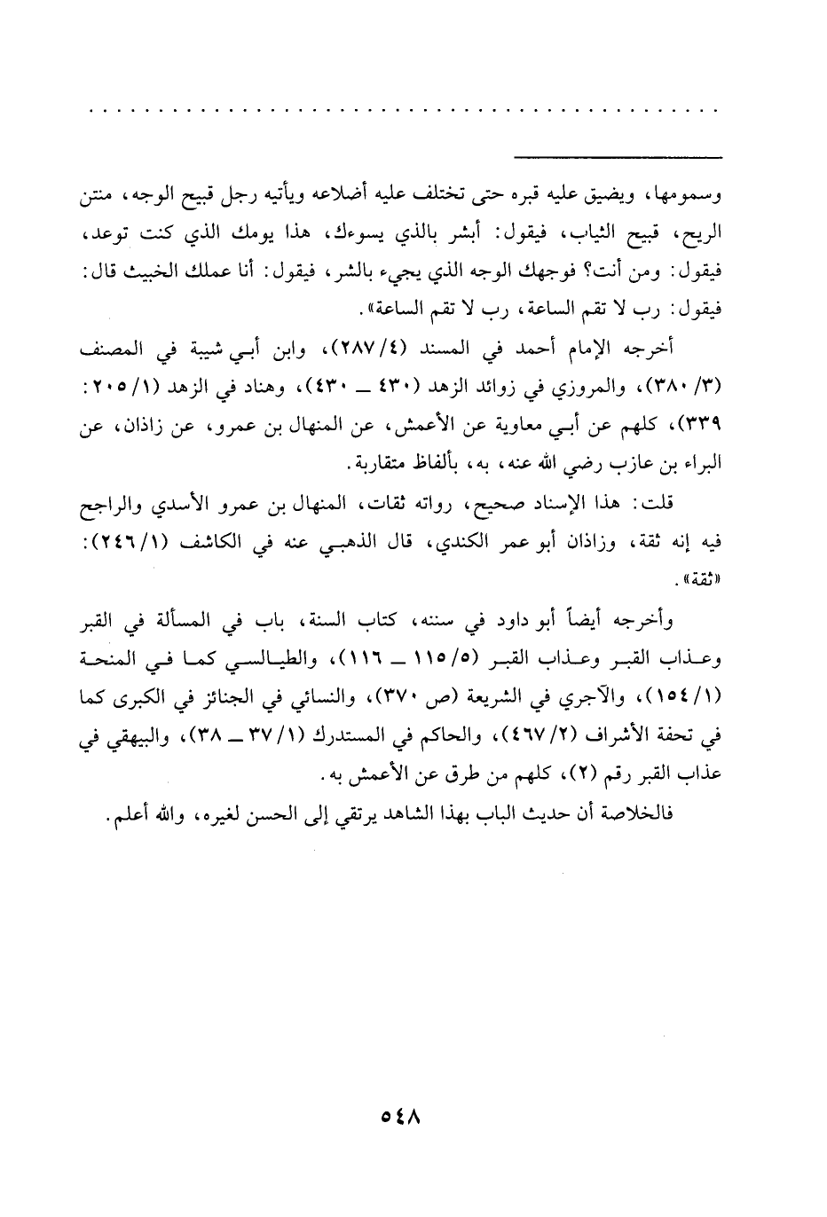 وأخرجه أيضًا أبو داود في سننه، كتاب السنَّة، باب في المسألة في القبر وعذاب القبر وعذاب القبر (5/ 115 - 116)، والطيالسي كما في المنحة (1/ 154)، والآجري في الشريعة (ص 379)، والنسائي في الجنائز في الكبرى كما في تحفة الأشراف (2/ 467)، والحاكم في المستدرك (1/ 37 - 38)، والبيهقي في عذاب القبر رقم (2)، كلهم من طرق عن الأعمش به.