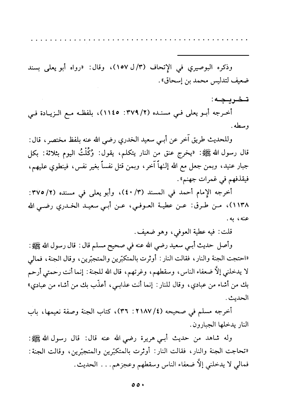 وأصل حَدِيثُ أَبِي سَعِيدٍ رَضِيَ اللَّهُ عَنْهُ فِي صحيح مسلم قَالَ: قَالَ رَسُولُ اللَّهِ -صَلَّى اللَّهُ عَلَيْهِ وسلم-: "احتجت الجنة والنار، فقالت النار: أوثرت بالمتكبّرين والمتجبّرين، وقال الجنة، فمالي لا يدخلني إلَّا ضعفاء الناس، وسقطهم، وغرتهم، قال الله للجنة: إنما أنت رحمتي أرحم بك من أشاء من عبادي، وقال للنار: إنما أنت عذابي، أعذب بك من أشاء من عبادي" الحديث.