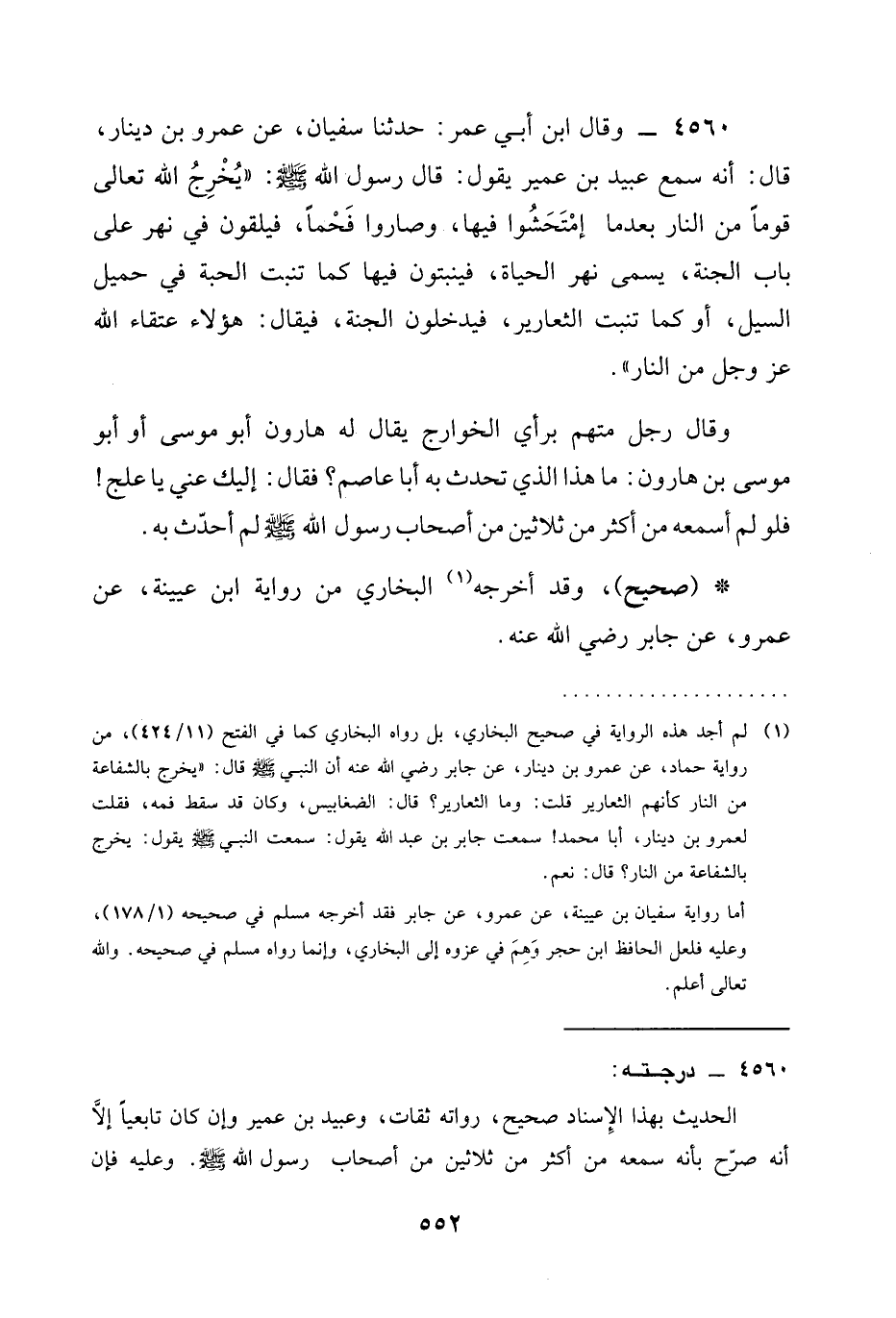 4560 - وَقَالَ ابْنُ أَبِي عُمَرَ: حَدَّثَنَا سُفْيَانُ، عَنْ عَمْرِو بْنِ دِينَارٍ، قَالَ: إِنَّهُ سَمِعَ عُبَيْدَ بْنَ عُمَيْرٍ يَقُولُ: قَالَ رَسُولُ اللَّهِ صَلَّى اللَّهُ عَلَيْهِ وَسَلَّمَ: " §يُخْرِجُ الله تعالى قَوْمًا من النار بعدما امْتُحِشُوا فِيهَا، وَصَارُوا فَحْمًا، فَيُلْقَوْنَ فِي نَهْرٍ عَلَى بَابِ الْجَنَّةِ، يُسَمَّى نَهْرُ الحياة، فينبتون فيها كَمَا تَنْبُتُ الْحَبَّةُ فِي حَمِيلِ السَّيْلِ، أَوْ كَمَا تَنْبُتُ الثَّعَارِيرُ، فَيَدْخُلُونَ الْجَنَّةَ، فَيُقَالَ: هَؤُلَاءِ عُتَقَاءُ اللَّهِ عَزَّ وَجَلَّ من النار ".