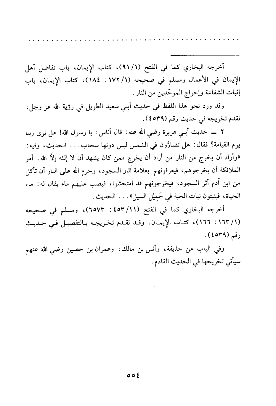 = أخرجه البخاري كما في الفتح (1/ 91)، كتاب الإيمان، باب تفاضل أهل الإيمان في الاعمال ومسلم في صحيحه (1/ 172: 184)، كتاب الإيمان، باب إثبات الشفاعة وإخراج الموحّدين من النار.