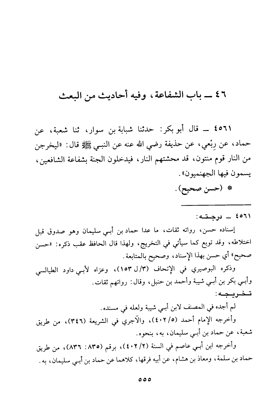 4561 - قَالَ أَبُو بَكْرٍ: حَدَّثَنَا شَبَابَةُ بْنُ سَوَّارٍ، ثنا شُعْبَةُ، عَنْ حَمَّادٍ، عَنْ رِبْعِيٍّ، عَنْ حُذَيْفَةَ رَضِيَ الله عَنْه عَنْ النَّبِيِّ صَلَّى اللَّهُ عَلَيْهِ وَسَلَّمَ قَالَ: " §لَيَخْرُجَنَّ مِنَ النار قوم منتون، قَدْ مَحَشَتْهُمُ النَّارُ، فَيَدْخُلُونَ الْجَنَّةَ بِشَفَاعَةِ الشَّافِعِينَ، يُسَمَّوْنَ فِيهَا الْجَهَنَّمِيُّونَ ".