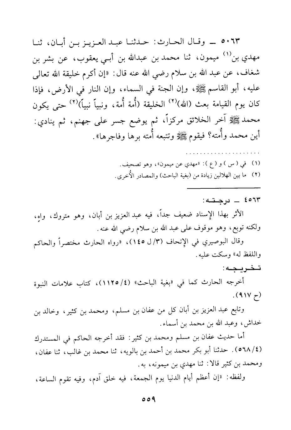 4563 - وَقَالَ الْحَارِثُ: حَدَّثَنَا عَبْدُ الْعَزِيزِ بْنُ أَبَانَ، ثنا مَهْدِيُّ بْنُ مَيْمُونٍ، ثنا مُحَمَّدُ بْنُ عَبْدِ اللَّهِ بْنِ أَبِي يَعْقُوبَ، عَنْ بِشْرِ بْنِ شَغَافٍ، عَنْ عَبْدِ اللَّهِ بْنِ سَلَامٍ رَضِيَ الله عَنْه قَالَ: " إِنَّ §أَكْرَمَ خليقة الله تعالى عَلَيْهِ، أَبُو الْقَاسِمِ صَلَّى اللَّهُ عَلَيْهِ وَسَلَّمَ، وَإِنَّ الْجَنَّةَ فِي السَّمَاءِ، وَإِنَّ النَّارَ فِي الْأَرْضِ، فَإِذَا كَانَ يَوْمُ الْقِيَامَةِ بَعَثَ (اللَّهُ) الْخَلِيقَةَ (أُمَّةً أُمَّةً، وَنَبِيًّا نَبِيًّا) حَتَّى يَكُونَ مُحَمَّدٌ صَلَّى اللَّهُ عَلَيْهِ وَسَلَّمَ آخِرَ الْخَلَائِقِ مَرْكَزًا، ثُمَّ يُوضَعُ جِسْرٌ عَلَى جَهَنَّمَ، ثُمَّ يُنَادِي: أَيْنَ مُحَمَّدٌ وَأُمَّتُهُ؟ فَيَقُومُ صَلَّى اللَّهُ عَلَيْهِ وَسَلَّمَ وَتَتْبَعُهُ أُمَّتُهُ بَرُّهَا وَفَاجِرُهَا ".