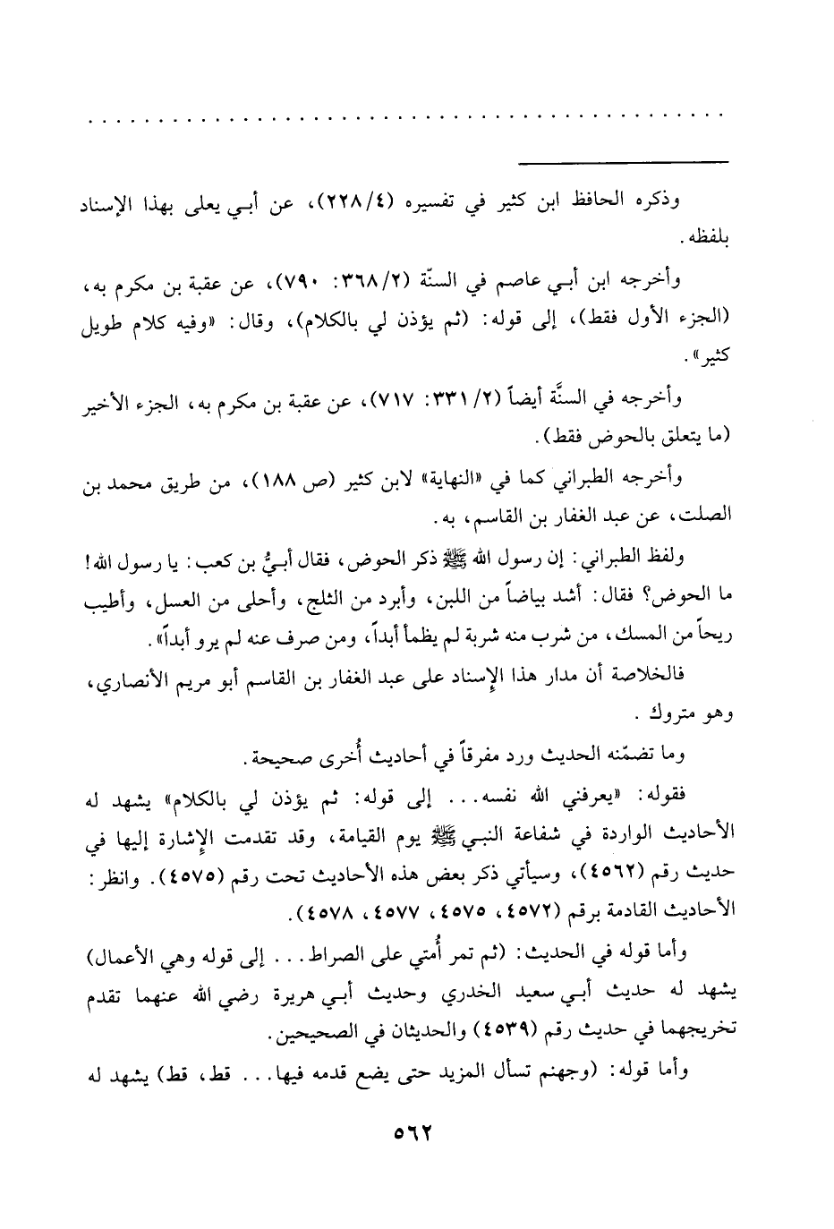 وأخرجه في السنَّة أيضًا (2/ 331: 717)، عن عقبة بن مكرم به، الجزء الأخير (ما يتعلق بالحوض فقط).