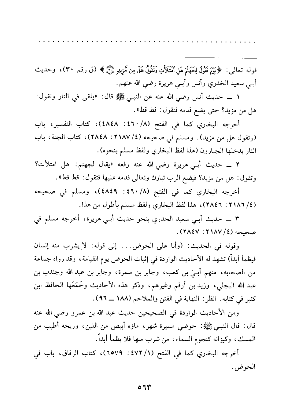 = قوله تعالى: {يَوْمَ نَقُولُ لِجَهَنَّمَ هَلِ امْتَلَأْتِ وَتَقُولُ هَلْ مِنْ مَزِيدٍ (30)} (ق رقم 30)، وحديث أبي سعيد الخدري وأنس وأبي هريرة رضي الله عنهم.