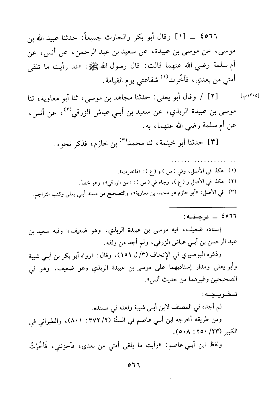 4566 -[1] وَقَالَ أَبُو بَكْرٍ وَالْحَارِثُ جَمِيعًا: حدثنا عُبَيْدُ اللَّهِ بْنُ مُوسَى، عَنْ مُوسَى بْنِ عُبَيْدَةَ، عَنْ سَعِيدِ بْنِ عَبْدِ الرَّحْمَنِ، عَنْ أَنَسٍ، عَنْ أُمِّ سلمة رَضِيَ الله عَنْهما قَالَتْ: قَالَ رَسُولُ اللَّهِ صَلَّى اللَّهُ عَلَيْهِ وَسَلَّمَ: " قَدْ §رَأَيْتُ مَا تَلْقَى أُمَّتِي مِنْ بَعْدِي، فَأَخَّرْتُ شَفَاعَتِي يَوْمِ الْقِيَامَةِ.