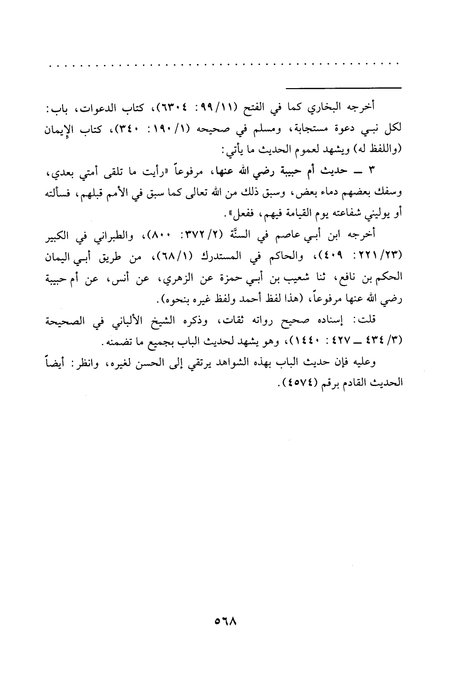 3 - حديث أم حبيبة رضي الله عنها، مرفوعًا "رأيت ما تلقى أمتي بعدي، وسفك بعضهم دماء بعض، وسبق ذلك من الله تعالى كما سبق في الأمم قبلهم، فسألته أو يوليني شفاعته يوم القيامة فيهم، ففعل".