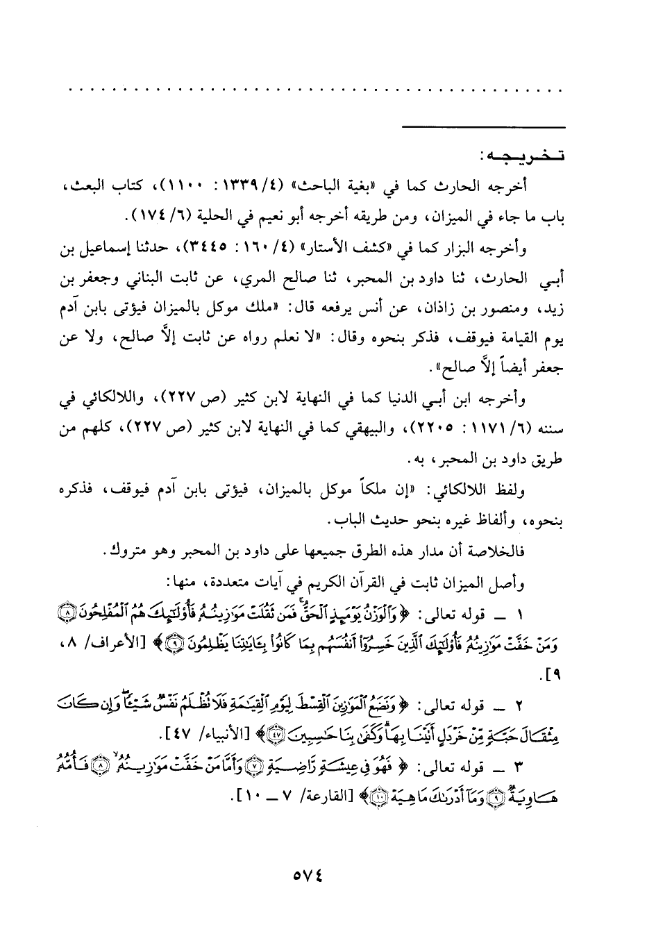 1 - قوله تعالى: {وَالْوَزْنُ يَوْمَئِذٍ الْحَقُّ فَمَنْ ثَقُلَتْ مَوَازِينُهُ فَأُولَئِكَ هُمُ الْمُفْلِحُونَ (8) وَمَنْ خَفَّتْ مَوَازِينُهُ فَأُولَئِكَ الَّذِينَ خَسِرُوا أَنْفُسَهُمْ بِمَا كَانُوا بِآيَاتِنَا يَظْلِمُونَ (9)} [الأعراف: 8، 9].