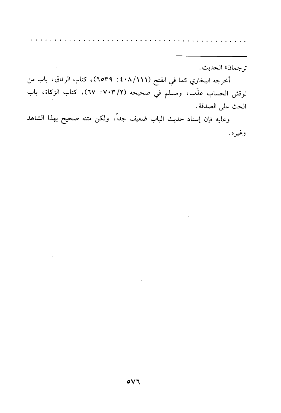 أخرجه البخاري كما في الفتح (111/ 408: 6539)، كتاب الرقاق، باب من نوقش الحساب عذّب، ومسلم في صحيحه (3/ 702: 67)، كتاب الزكاة، باب الحث على الصدقة.