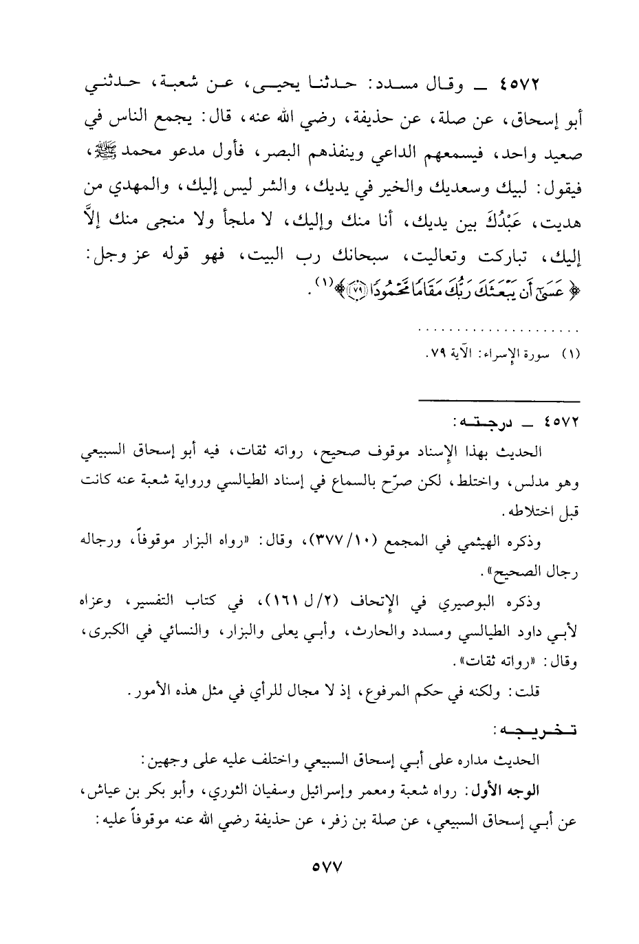4572 - وَقَالَ مُسَدَّدٌ: حَدَّثَنَا يَحْيَى، عَنْ شُعْبَةَ، حَدَّثَنِي أَبُو إِسْحَاقَ، عَنْ صِلَةَ، عَنْ حُذَيْفَةَ، رَضِيَ الله عَنْه، قَالَ: §يُجْمَعُ النَّاسُ فِي صَعِيدٍ وَاحِدٍ، فَيُسْمِعُهُمُ الدَّاعِي وَيَنْفُذُهُمُ الْبَصَرُ، فَأَوَّلُ مَدْعُوٍّ مُحَمَّدٌ صَلَّى اللَّهُ عَلَيْهِ وَسَلَّمَ، فَيَقُولُ: لَبَّيْكَ وَسَعْدَيْكَ وَالْخَيْرُ فِي يَدَيْكَ، وَالشَّرُّ لَيْسَ إِلَيْكَ، وَالْمَهْدِيُّ مَنْ هَدَيْتَ، عَبْدُكَ بَيْنَ يَدَيْكَ، أَنَا مِنْكَ وَإِلَيْكَ، لَا مَلْجَأَ وَلَا مَنْجَى مِنْكَ إِلَّا إِلَيْكَ، تَبَارَكْتَ وَتَعَالَيْتَ، سُبْحَانَكَ رَبَّ الْبَيْتِ، فهو قوله عز وجل: {عَسَى أَنْ يَبْعَثَكَ رَبُّكَ مَقَامًا مَحْمُودًا -[581]- (79) } .