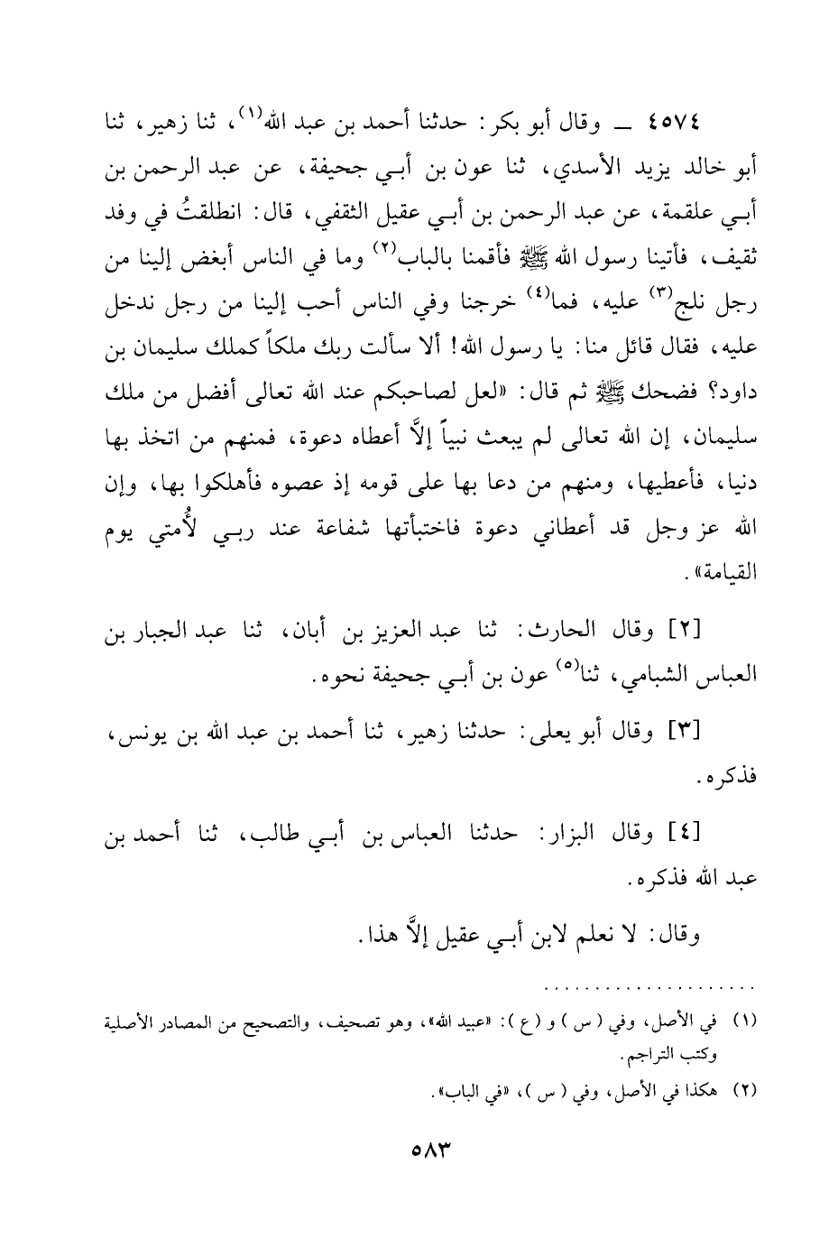 4574 - وَقَالَ أَبُو بَكْرٍ: حَدَّثَنَا أَحْمَدُ بْنُ عَبْدِ اللَّهِ، ثنا زُهَيْرٌ، ثنا أَبُو خَالِدٍ يَزِيدُ الْأَسَدِيُّ، ثنا عَوْنُ بْنُ أَبِي جُحَيْفَةَ، عَنْ عَبْدِ الرَّحْمَنِ بْنِ أَبِي عَلْقَمَةَ، عَنْ عَبْدِ الرَّحْمَنِ بْنِ أَبِي عَقِيلٍ الثَّقَفِيِّ، قَالَ: انْطَلَقْتُ فِي وَفْدِ ثَقِيفٍ، فَأَتَيْنَا رَسُولَ اللَّهِ صَلَّى اللَّهُ عَلَيْهِ وَسَلَّمَ فَأَقَمْنَا بِالْبَابِ وَمَا فِي النَّاسِ أَبْغَضُ إِلَيْنَا مِنْ رَجُلٍ نَلِجُ عَلَيْهِ، فَمَا خَرَجْنَا وَفِي النَّاسِ أَحَبُّ إِلَيْنَا من رجل ندخل عَلَيْهِ، فَقَالَ قَائِلٌ مِنَّا: يَا رَسُولَ اللَّهِ! أَلَا سَأَلْتَ رَبَّكَ مُلْكًا كَمُلْكِ سُلَيْمَانَ بْنِ دَاوُدَ؟ فَضَحِكَ صَلَّى اللَّهُ عَلَيْهِ وَسَلَّمَ ثُمَّ قَالَ: " §لَعَلَّ لِصَاحِبِكُمْ عند الله تعالى أَفْضَلُ مِنْ مُلْكِ سُلَيْمَانَ، إن الله تعالى لَمْ يَبْعَثْ نَبِيًّا إِلَّا أَعْطَاهُ دَعْوَةً، فَمِنْهُمْ مَنِ اتَّخَذَ بِهَا دُنْيَا، فَأُعْطِيَهَا، وَمِنْهُمْ مَنْ دَعَا بِهَا عَلَى قَوْمِهِ إِذْ عَصَوْهُ فَأُهْلِكُوا بِهَا، وإن الله عز وجل قَدْ أَعْطَانِي دَعْوَةً فَاخْتَبَأْتُهَا شَفَاعَةً عِنْدَ رَبِّي لِأُمَّتِي يَوْمَ الْقِيَامَةِ ".