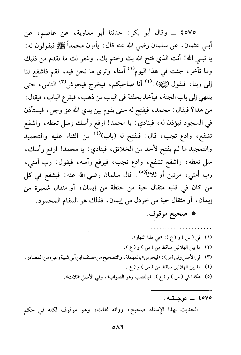 4575 - وَقَالَ أَبُو بَكْرٍ: حَدَّثَنَا أَبُو مُعَاوِيَةَ، عَنْ عَاصِمٍ، عَنْ أَبِي عُثْمَانَ، عَنْ سَلْمَانَ رَضِيَ الله عَنْه قَالَ: يَأْتُونَ مُحَمَّدًا صَلَّى اللَّهُ عَلَيْهِ وَسَلَّمَ فَيَقُولُونَ لَهُ: يَا نَبِيَّ اللَّهِ! أَنْتَ الَّذِي فَتَحَ اللَّهُ بِكَ وَخَتَمَ بِكَ، وَغَفَرَ لَكَ مَا تَقَدَّمَ مِنْ ذَنْبِكَ وَمَا تَأَخَّرَ، جِئْتَ فِي هَذَا الْيَوْمِ آمِنًا، وَتَرَى مَا نَحْنُ فِيهِ، فَقُمْ فَاشْفَعْ لنا إلى ربنا، فَيَقُولُ (صَلَّى اللَّهُ عَلَيْهِ وَسَلَّمَ) : أَنَا صَاحِبُكُمْ، فَيَخْرُجُ فَيَحُوشُ النَّاسَ، حَتَّى يَنْتَهِيَ إِلَى بَابِ الْجَنَّةِ، فَيَأْخُذُ بِحَلْقَةٍ فِي الْبَابِ مِنْ ذَهَبٍ، فَيَقْرَعُ الْبَابَ، فَيُقَالُ: مَنْ هَذَا؟ فَيُقَالُ: مُحَمَّدٌ، فَيُفْتَحُ لَهُ حَتَّى يَقُومَ بَيْنَ يدي الله عز وجل، فَيَسْتَأْذِنُ فِي السُّجُودِ فَيُؤْذَنُ لَهُ، فَيُنَادَى: يَا مُحَمَّدُ! §ارْفَعْ رَأْسَكَ وَسَلْ تُعْطَهْ، وَاشْفَعْ تُشَفَّعْ، وَادْعُ تُجَبْ، قَالَ: فَيُفْتَحُ لَهُ (بَابٌ) مِنَ الثَّنَاءِ عَلَيْهِ وَالتَّحْمِيدِ وَالتَّمْجِيدِ مَا لَمْ يُفْتَحْ لِأَحَدٍ مِنَ الْخَلَائِقِ، فَيُنَادَى: يَا مُحَمَّدُ! ارْفَعْ رَأْسَكَ، سَلْ تُعْطَهْ، وَاشْفَعْ تُشَفَّعْ، وَادْعُ تُجَبْ، فَيَرْفَعُ رَأْسَهُ، فَيَقُولُ: رب أمتي، رَبِّ أُمَّتِي، مَرَّتَيْنِ أَوْ ثَلَاثًا. قَالَ سَلْمَانُ رَضِيَ الله عَنْه: فَيَشْفَعُ فِي كُلِّ مَنْ كَانَ فِي قَلْبِهِ مِثْقَالُ حَبَّةٍ مِنْ حِنْطَةٍ مِنْ إِيمَانٍ، أَوْ مِثْقَالُ شَعِيرَةٍ مِنْ إِيمَانٍ، أَوْ مِثْقَالُ حَبَّةٍ مِنْ خَرْدَلٍ من إيمان، فذلك هُوَ الْمَقَامُ الْمَحْمُودُ.