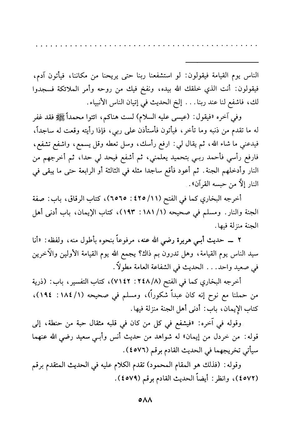 وقوله في آخره: "فَيَشْفَعُ فِي كُلِّ مَنْ كَانَ فِي قَلْبِهِ مثقال حبَّة من حنطة، إلى قوله: من خردل من إيمان " له شواهد من حديث أنس وأبي سعيد رضي الله عنهما سيأتي تخريجهما في الحديث القادم برقم (4576).