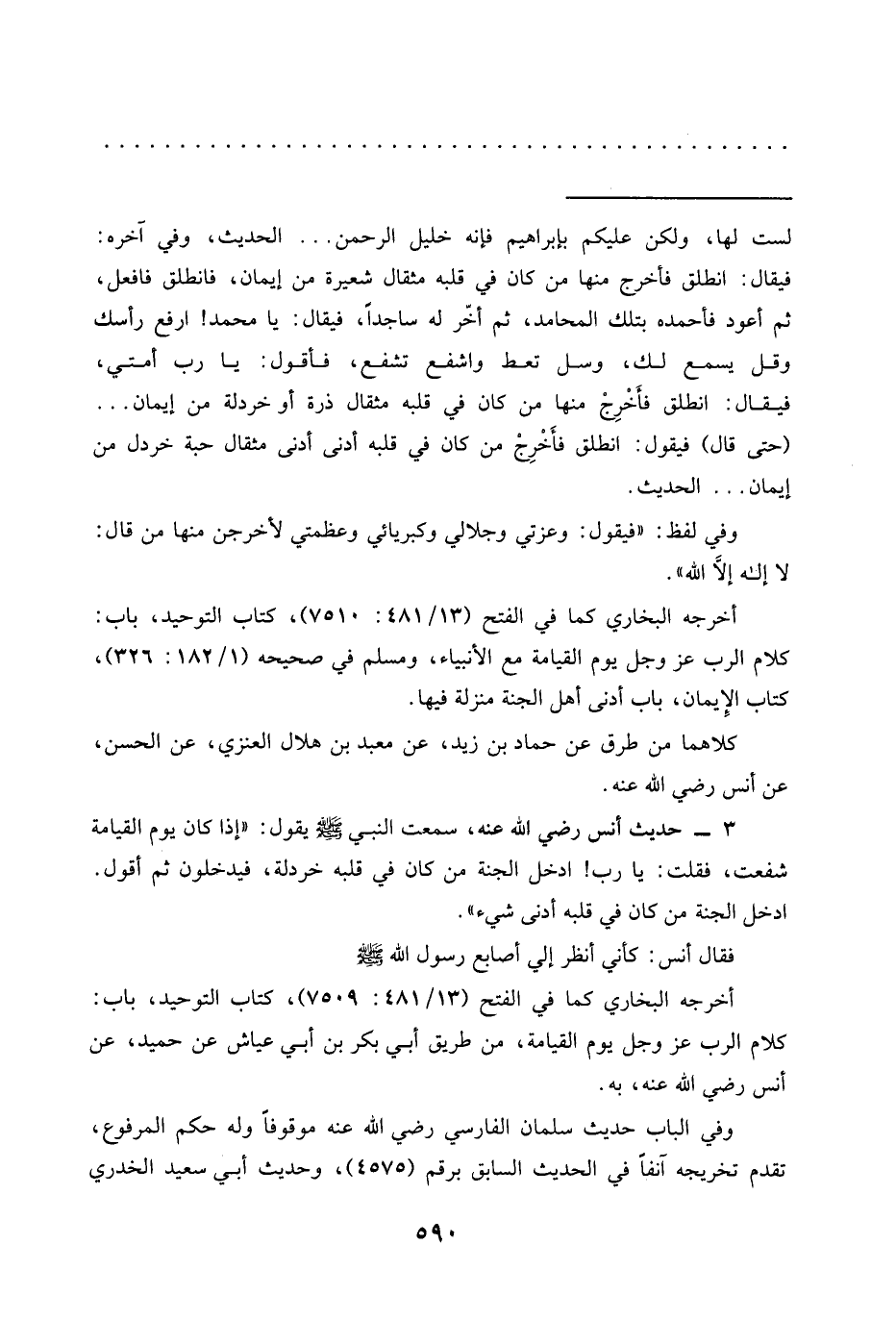 فيقال: انطلق فأخرج منها من كان في قلبه مثقال شعيرة من إيمان، فانطلق فافعل، ثم أعود فأحمده بتلك المحامد، ثم أخر له ساجدًا، فيقال: يا محمَّد! ارفع رأسك وقل يسمع لك، وسل تعط واشفع تشفع، فأقول: يا رب أمتي، فيقال: انطلق فأَخْرِجْ منها من كان في قلبه مثقال ذرة أو خردلة من إيمان ... (حتى قال) فيقول: انطلق فأَخْرِجْ من كان في قلبه أدنى أدنى مثقال حبَّة خردل من إيمان ... الحديث.