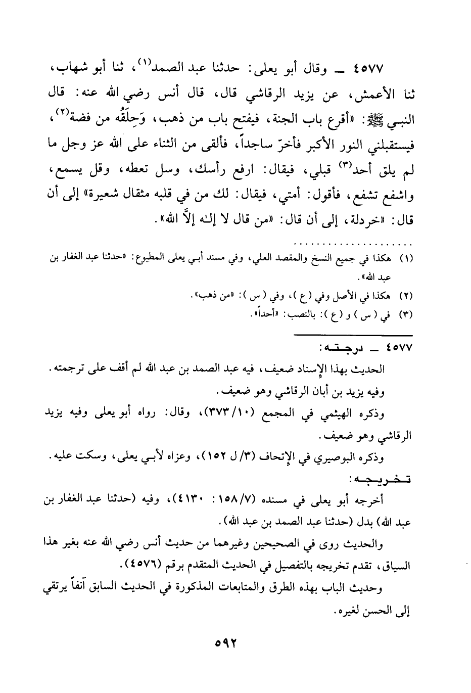 4577 - وَقَالَ أَبُو يَعْلَى: حَدَّثَنَا عَبْدُ الصَّمَدِ، ثنا أَبُو شِهَابٍ، ثنا الْأَعْمَشُ، عَنْ يَزِيدَ الرَّقَاشِيِّ قَالَ، قَالَ أَنَسٌ رَضِيَ الله عَنْه: قَالَ النَّبِيُّ صَلَّى اللَّهُ عَلَيْهِ وَسَلَّمَ: " §أَقْرَعُ بَابَ الْجَنَّةِ، فَيُفْتَحُ بَابٌ مِنْ ذَهَبٍ، وَحَلْقَةٌ مِنْ فِضَّةٍ، فَيَسْتَقْبِلُنِي النُّورُ الْأَكْبَرُ فَأَخِرُّ سَاجِدًا، فَأُلْقِي مِنَ الثَّنَاءِ على الله عز وجل مَا لَمْ يُلْقِ أَحَدٌ قَبْلِي، فَيُقَالُ: ارْفَعْ رَأْسَكَ، وَسَلْ تعطه، وقل يسمع، وَاشْفَعْ تُشَفَّعْ، فَأَقُولُ أُمَّتِي، فَيُقَالُ: لَكَ مَنْ فِي قَلْبِهِ مِثْقَالُ شَعِيرَةٍ " إِلَى أَنْ قَالَ: " خَرْدَلَةً، إِلَى أَنْ قَالَ: " مَنْ قَالَ لَا إِلَهَ إِلَّا اللَّهُ ".