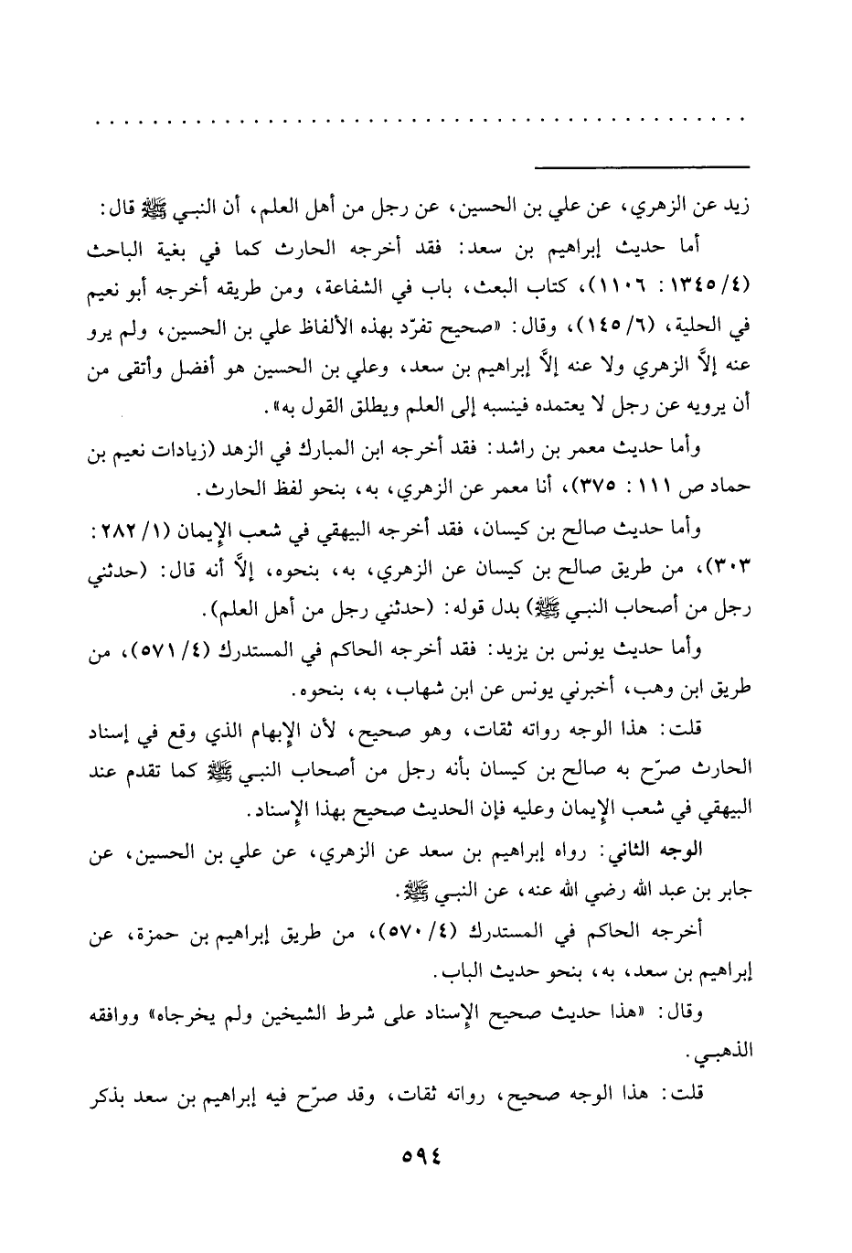 أما حديث إبراهيم بن سعد: فقد أخرجه الحارث كما في بغية الباحث (4/ 1345: 1106)، كتاب البعث، باب في الشفاعة، ومن طريقه أخرجه أبو نعيم في الحلية، (6/ 145)، وقال: "صحيح تفرّد بهذه الألفاظ علي بن الحسين، ولم يرو عنه إلَّا الزهري ولا عنه إلَّا إبراهيم بن سعد، وعلي بن الحسين هو أفضل وأتقى من أن يرويه عن رجل لا يعتمده فينسبه إلى العلم ويطلق القول به".