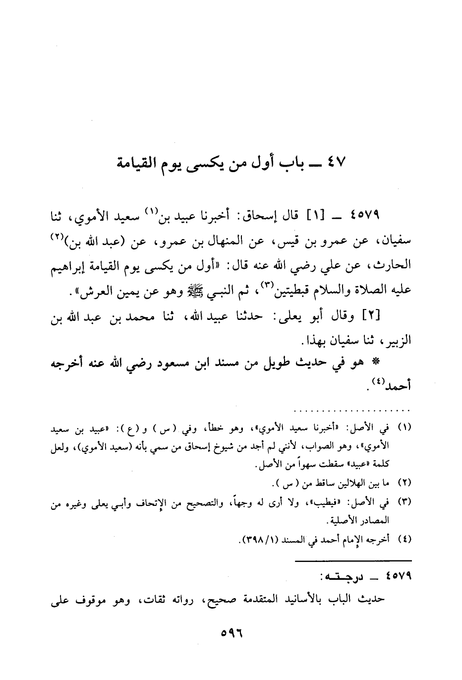 4579 -[1] قال إسحاق: أخبرنا عُبَيْدُ بْنُ سَعِيدٍ الْأُمَوِيُّ، ثنا سُفْيَانُ، عَنْ عَمْرِو بْنِ قَيْسٍ، عَنِ الْمِنْهَالِ بْنِ عَمْرٍو، عَنْ (عَبْدِ اللَّهِ بْنِ) الْحَارِثِ، عَنْ عَلِيٍّ رَضِيَ الله عَنْه قَالَ: " §أَوَّلُ مَنْ يُكْسَى يَوْمَ القيامة إبراهيم عليه الصلاة والسلام قُبْطِيَّتَيْنِ، ثُمَّ النَّبِيُّ صَلَّى اللَّهُ عَلَيْهِ وَسَلَّمَ وَهُوَ عَنْ يَمِينِ الْعَرْشِ ".