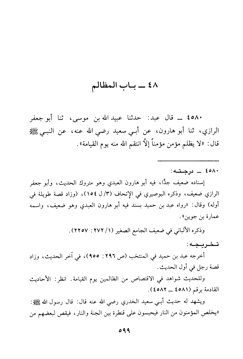 4580 - قَالَ عَبْدُ: حَدَّثَنَا عُبَيْدُ اللَّهِ بْنُ مُوسَى، ثنا أَبُو جَعْفَرٍ الرَّازِيُّ، ثنا أَبُو هَارُونَ، عَنْ أَبِي سعيد رَضِيَ الله عَنْه، عن النبي صَلَّى اللَّهُ عَلَيْهِ وَسَلَّمَ قَالَ: " §لَا يَظْلِمُ مُؤْمِنٌ مُؤْمِنًا إِلَّا انْتَقَمَ اللَّهُ مِنْهُ يَوْمَ الْقِيَامَةِ ".