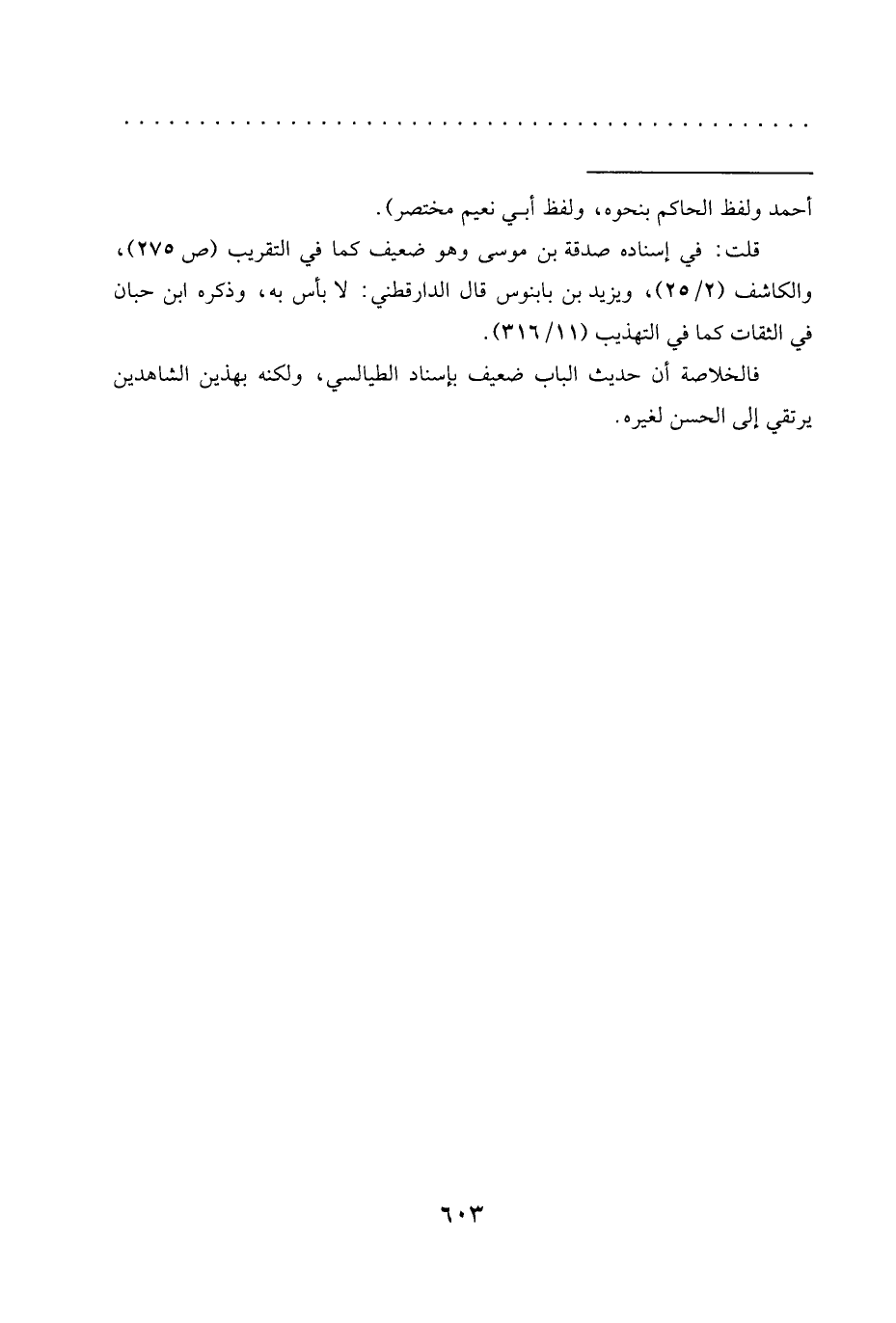 فالخلاصة أن حديث الباب ضعيف بإسناد الطيالسي، ولكنه بهذين الشاهدين يرتقي إلى الحسن لغيره.