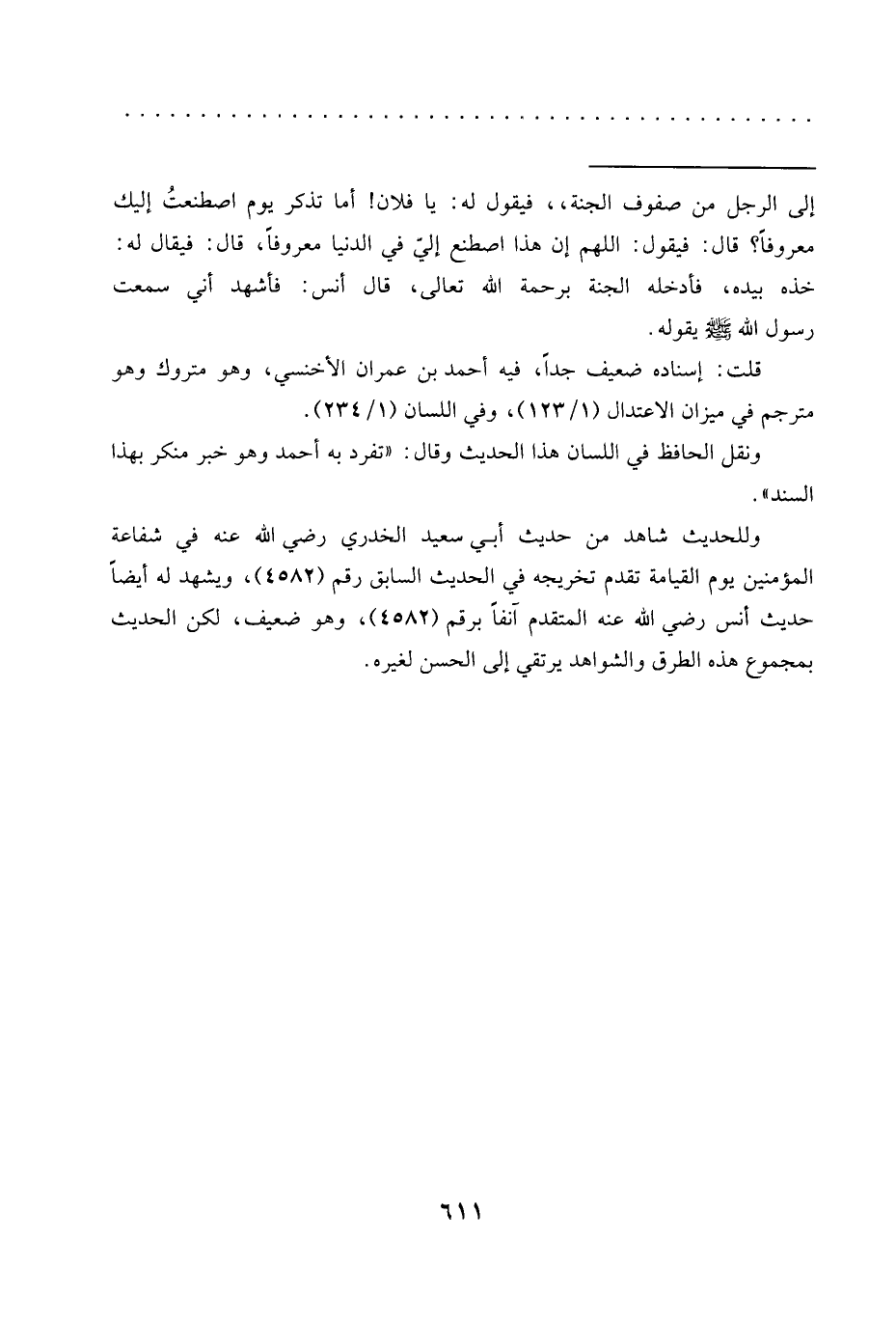 = إلى الرجل من صفوف الجنة، فيقول له: يا فلان! أما تذكر يوم اصطنعتُ إليك معروفًا؟ قال: فيقول: اللهم إن هذا اصطنع إليّ في الدنيا معروفًا، قال: فيقال له: خذه بيده، فأدخله الجنة برحمة الله تعالى، قال أنس: فَأَشْهَدُ أَنِّي سَمِعْتُ رَسُولَ اللَّهِ -صَلَّى اللَّهُ عليه وسلم- يقوله.