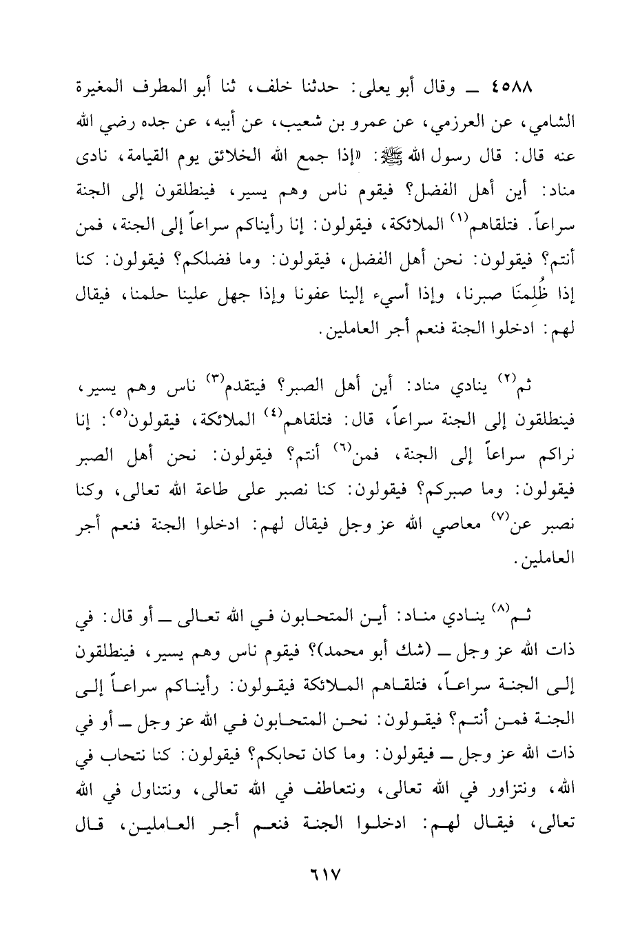 4588 - وَقَالَ أَبُو يَعْلَى: حَدَّثَنَا خَلَفٌ، ثنا أَبُو الْمُطَرِّفِ الْمُغِيرَةُ الشَّامِيُّ، عَنِ الْعَرْزَمِيَّ، عَنْ عَمْرِو بْنِ شُعَيْبٍ، عَنْ أَبِيهِ، عَنْ جَدِّهِ رَضِيَ الله عَنْه قَالَ: قَالَ رَسُولُ اللَّهِ صَلَّى اللَّهُ عَلَيْهِ وَسَلَّمَ: " §إِذَا جَمَعَ اللَّهُ الْخَلَائِقَ يَوْمَ الْقِيَامَةِ، نَادَى مُنَادٍ: أَيْنَ أَهْلُ الْفَضْلِ؟ فَيَقُومُ نَاسٌ وَهُمْ يَسِيرٌ، فَيَنْطَلِقُونَ إِلَى الجنة سراعاً. فتلقاهم الْمَلَائِكَةُ، فَيَقُولُونَ: إِنَّا رَأَيْنَاكُمْ سِرَاعًا إِلَى الْجَنَّةِ، فَمَنْ أَنْتُمْ؟ فَيَقُولُونَ: نَحْنُ أَهْلُ الْفَضْلِ، فَيَقُولُونَ: وَمَا فَضْلُكُمْ؟ فَيَقُولُونَ: كُنَّا إذا ظُلِمْنَا صَبَرْنَا، وَإِذَا أُسِيءَ إِلَيْنَا عَفَوْنَا وَإِذَا جُهِلَ عَلَيْنَا حَلُمْنَا، فَيُقَالُ لَهُمُ: ادْخُلُوا الْجَنَّةَ فَنِعْمَ أَجْرُ الْعَامِلِينَ.