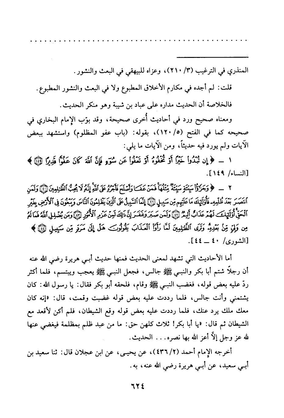 ومعناه صحيح ورد في أحاديث أخرى صحيحة، وقد بوّب الإِمام البخاري في صحيحه كما في الفتح (5/ 120)، بقوله: (باب عفو المظلوم) واستشهد ببعض الآيات ولم يورد فيه حديثًا، ومن الآيات ما يلي: