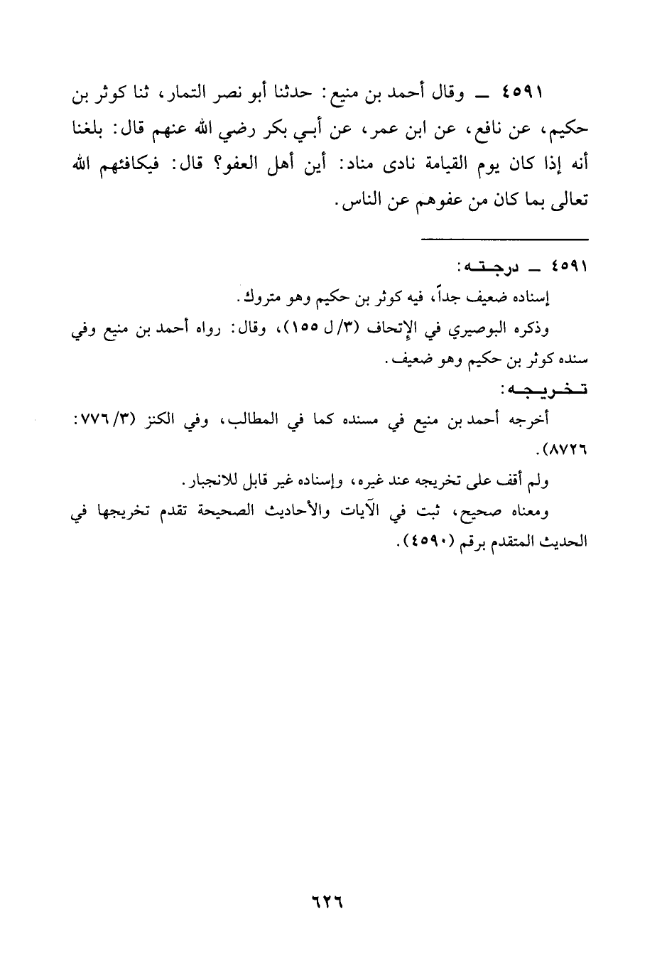 4591 - وَقَالَ أَحْمَدُ بْنُ مَنِيعٍ: حَدَّثَنَا أَبُو نَصْرٍ التَّمَّارُ، ثنا كَوْثَرُ بْنُ حكيم، عن نافع، عَنِ ابْنِ عُمَرَ، عَنْ أبي بكر رَضِيَ الله عَنْهم قَالَ: بَلَغَنَا أَنَّهُ §إِذَا كَانَ يَوْمُ الْقِيَامَةِ نَادَى مُنَادٍ: أَيْنَ أَهْلُ الْعَفْوِ؟ قَالَ: فَيُكَافِئُهُمُ اللَّهُ تَعَالَى بِمَا كَانَ مِنْ عَفْوِهِمِ عَنِ النَّاسِ.
