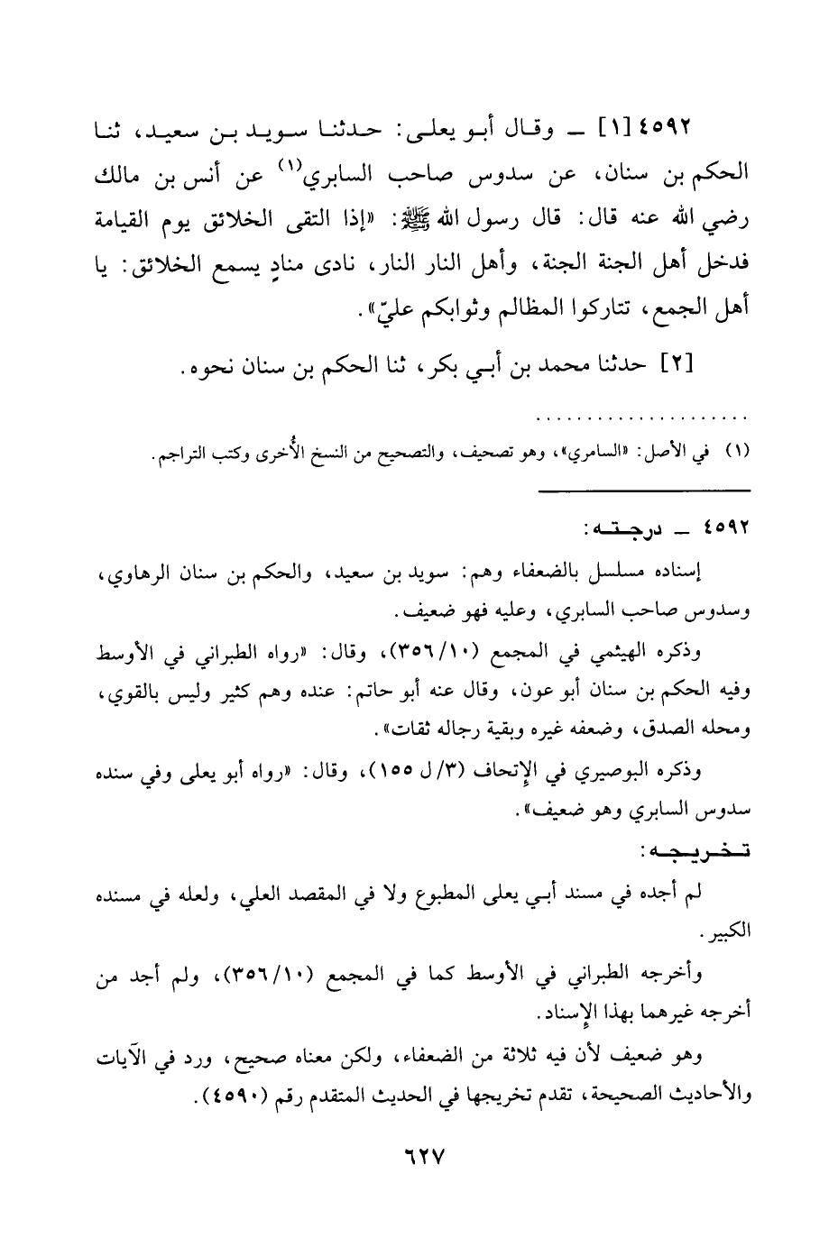 4592 -[1] وَقَالَ أَبُو يَعْلَى: حَدَّثَنَا سُوَيْدُ بْنُ سَعِيدٍ، ثنا الْحَكَمُ بْنُ سِنَانٍ، عَنْ سَدُوسٍ صَاحِبِ السَّابِرِيِّ عَنْ أَنَسِ بْنِ مَالِكٍ رَضِيَ الله عَنْه قَالَ: قَالَ رَسُولُ اللَّهِ صَلَّى اللَّهُ عَلَيْهِ وَسَلَّمَ: " §إِذَا الْتَقَى الْخَلَائِقُ يَوْمَ الْقِيَامَةِ فَدَخَلَ أَهْلُ الْجَنَّةِ الْجَنَّةَ، وَأَهْلُ النَّارِ النَّارَ، نَادَى مُنَادٍ يُسْمِعُ الْخَلَائِقَ: يَا أَهْلَ الْجَمْعِ، تَتَارَكُوا الْمَظَالِمَ وَثَوَابُكُمْ عَلَيَّ ".