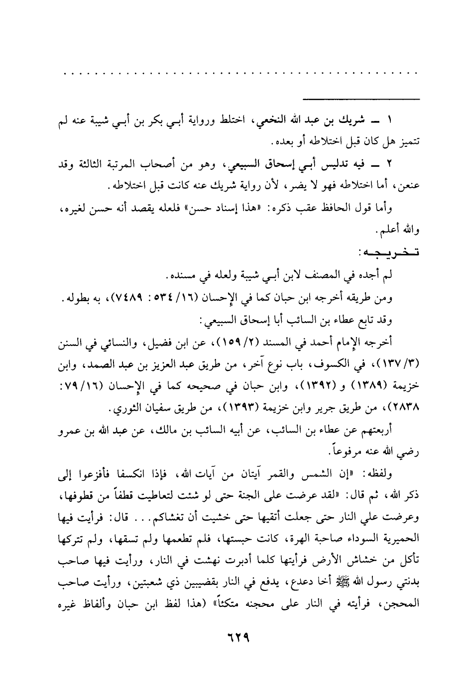 أخرجه الإِمام أحمد في المسند (2/ 159)، عن ابن فضيل، والنسائي في السنن (3/ 137)، في الكسوف، باب نوع آخر، من طريق عبد العزيز بن عبد الصمد، وابن خزيمة (1389) و (1392)، وابن حبّان في صحيحه كما في الإِحسان (1/ 796: 2838)، من طريق جرير وابن خزيمة (1393)، من طريق سفيان الثوري.
