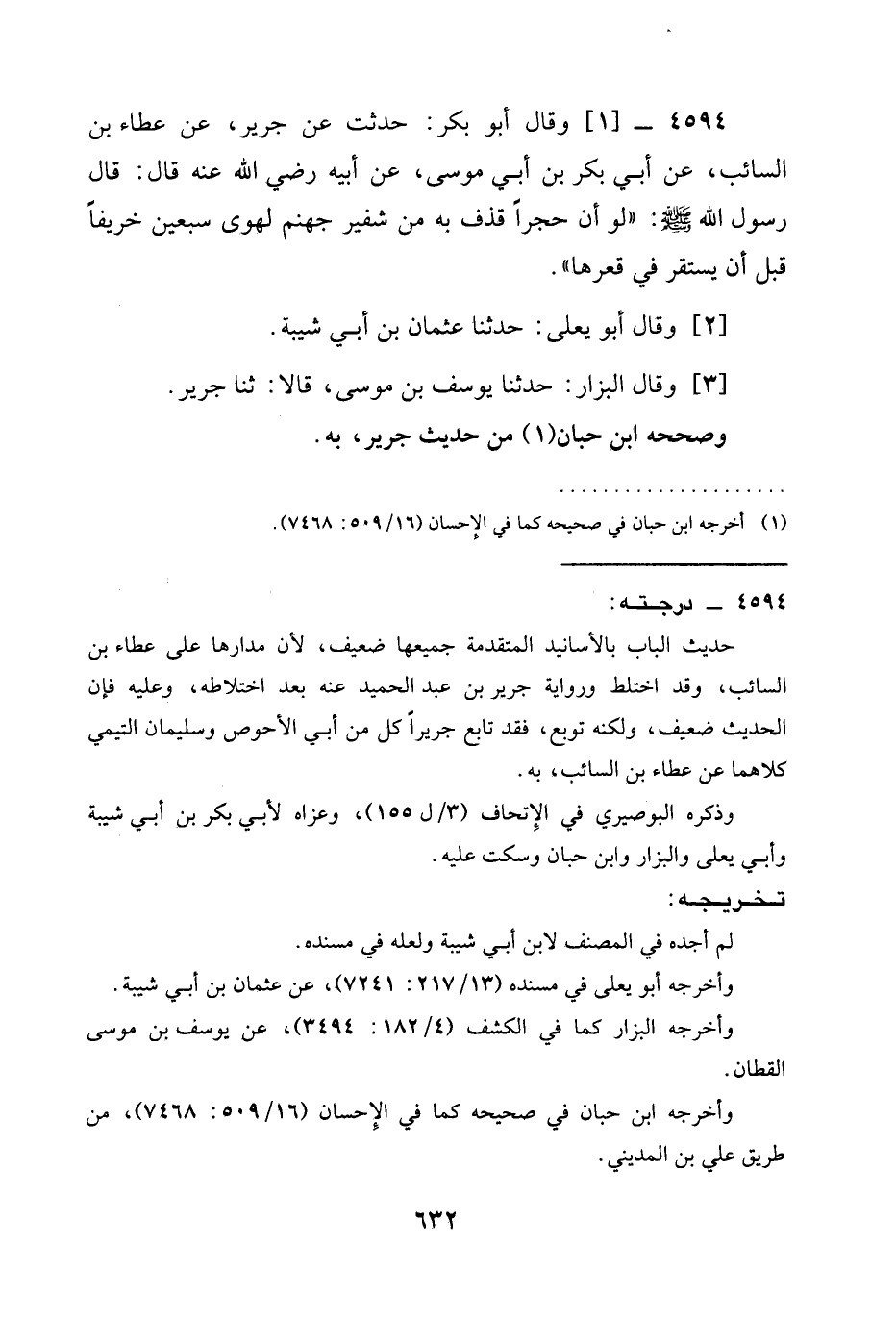 4594 -[1] وَقَالَ أَبُو بَكْرٍ: حُدِّثْتُ عَنْ جَرِيرٍ، عَنْ عَطَاءِ بْنِ السَّائِبِ، عَنْ أَبِي بَكْرِ بْنِ أَبِي مُوسَى، عَنْ أَبِيهِ رَضِيَ الله عَنْه قَالَ: قَالَ رَسُولُ اللَّهِ صَلَّى اللَّهُ عَلَيْهِ وَسَلَّمَ: " §لَوْ أَنَّ حَجَرًا قُذِفَ بِهِ مِنْ شَفِيرِ جَهَنَّمَ لَهَوَى سَبْعِينَ خَرِيفًا قَبْلَ أَنْ يَسْتَقِرَّ فِي قَعْرِهَا ".
