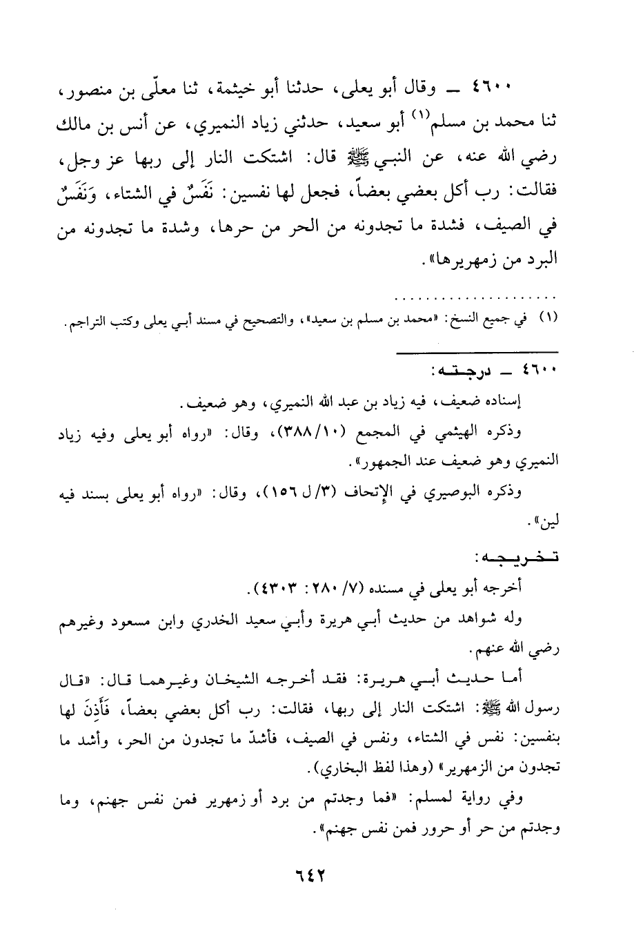 4600 - وَقَالَ أَبُو يَعْلَى، حَدَّثَنَا أَبُو خَيْثَمَةَ، ثنا مُعَلَّى بْنُ مَنْصُورٍ، ثنا مُحَمَّدُ بْنُ مُسْلِمٍ أَبُو سَعِيدٍ، حَدَّثَنِي زِيَادٌ النُّمَيْرِيُّ، عَنْ أَنَسِ بْنِ مَالِكٍ رَضِيَ الله عَنْه، عَنِ النَّبِيِّ صَلَّى اللَّهُ عَلَيْهِ وَسَلَّمَ قَالَ: §اشْتَكَتِ النَّارُ إلى ربها عز وجل، فَقَالَتْ: رَبِّ أَكَلَ بَعْضِي بَعْضًا، فَجَعَلَ لها نفسين: نَفَسٌ في الشتاء، وَنَفَسٌ فِي الصَّيْفِ، فشدة ما تجدونه مِنَ الْحَرِّ مِنْ حَرِّهَا، وشدة ما تجدونه مِنَ الْبَرْدِ مِنْ زَمْهَرِيرِهَا.
